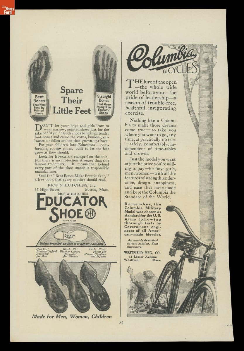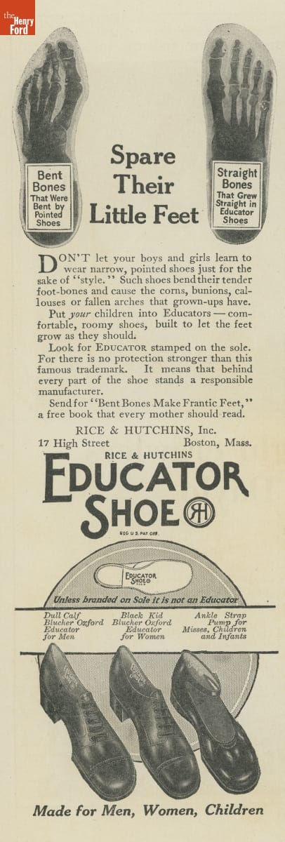 Educator Shoe brand was a subsidiary of Massachusetts-based footwear manufacturer and wholesaler Rice & Hutchins. Although the brand was primarily for children, mothers were their target customers. Educator commonly took out advertisements in women's magazines that claimed the shoes "let feet grow as they should;" ads juxtaposed images of the brand's wide toebox with other popular styles of the time.