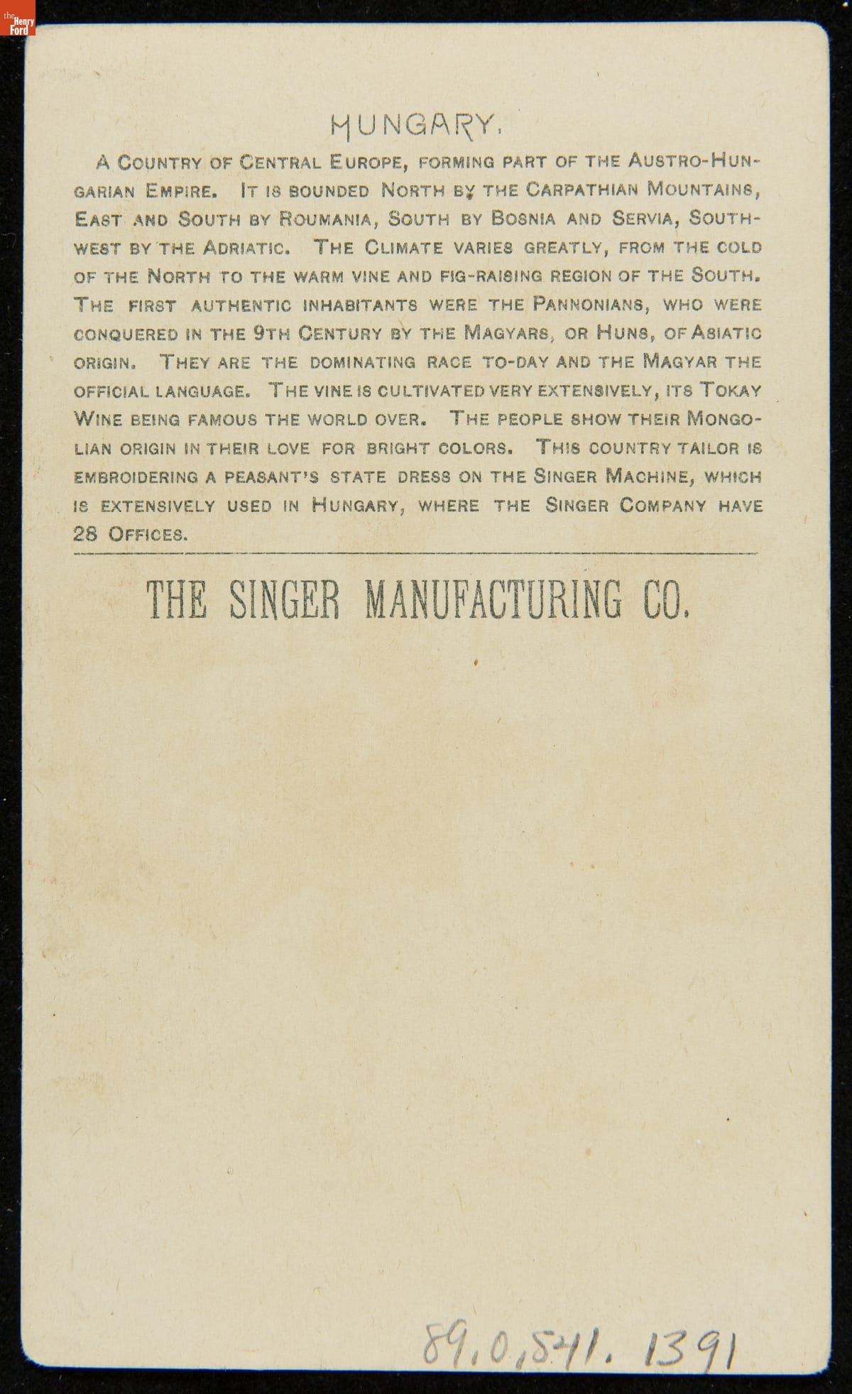 As color printing gained momentum in the late 19th century, trade cards became a major means of advertising goods and services. Americans enjoyed and often saved the vibrant little advertisements found in product packages or distributed by local merchants. The Singer Sewing Machine Company had a series of trade cards, like this one, offering images of Singer machine users from around the world in their national dress.