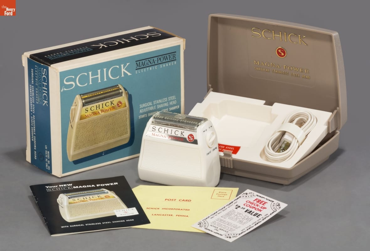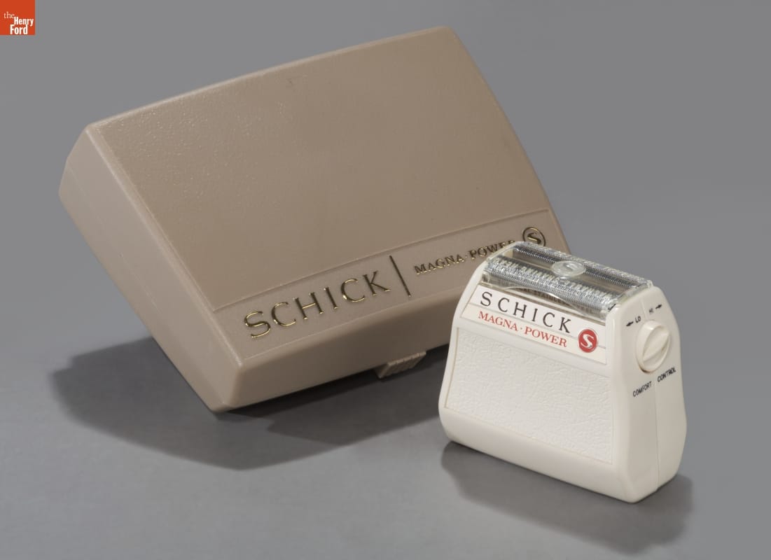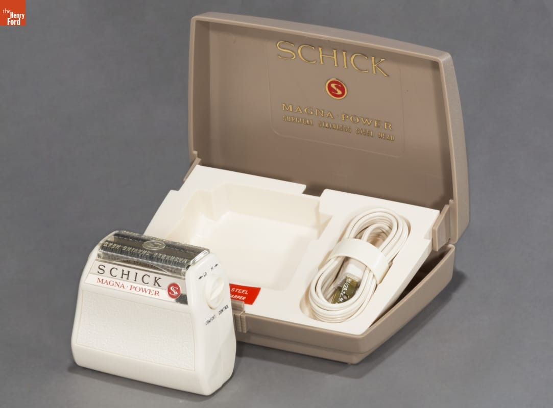 Jacob Schick patented the first successful electric razor in 1930 and began manufacturing his invention. The razors removed facial hair without lather or water, relying on an electric motor to move the cutting blades. Innovations and modern designs followed. Schick's company contracted with Mel Boldt and Associates to design the distinctive look of this razor from the 1960s.