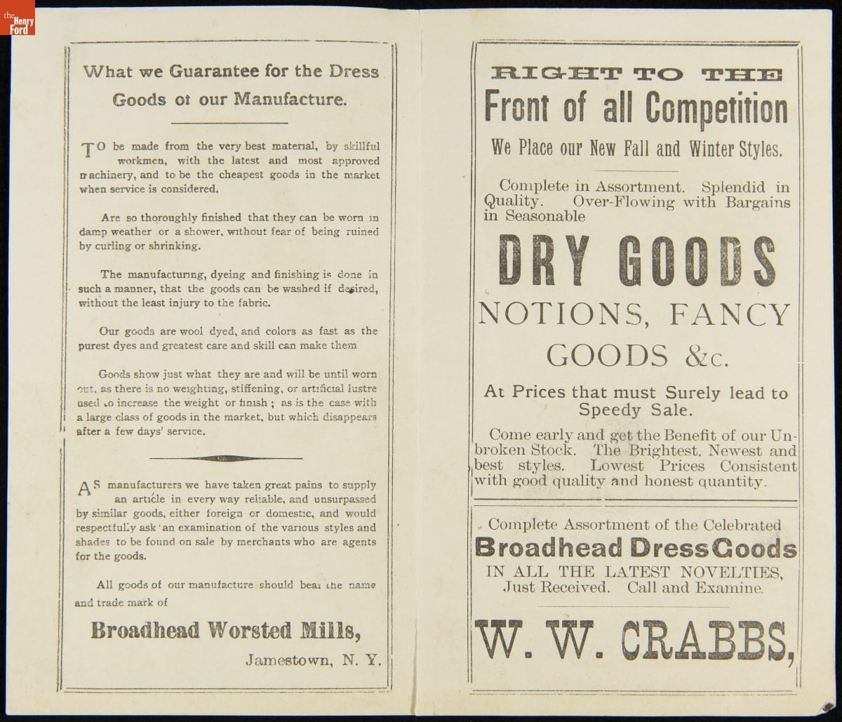 Manufactured by Broadhead Worsted Mills, Jamestown, New York. Retailed by W.W. Crabbs, Morenci, Michigan. Lithographed by J. Ottmann Lithographic Company, New York, New York.