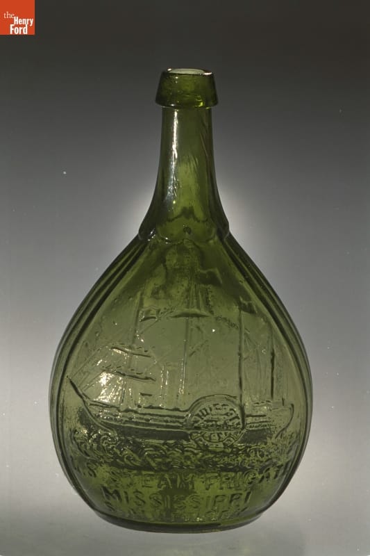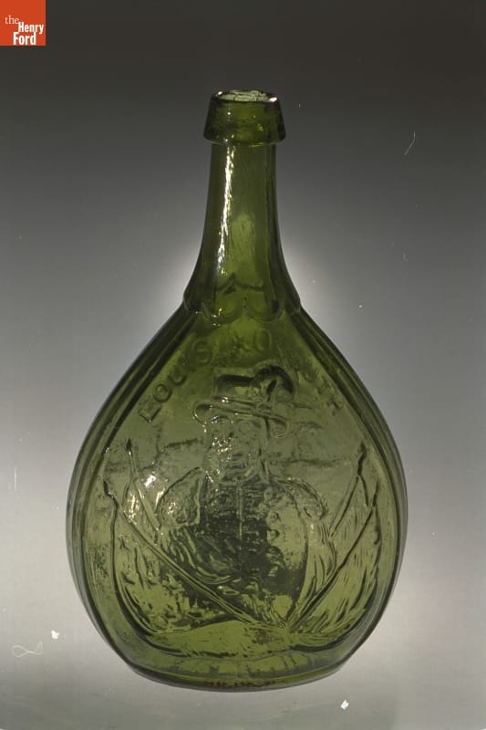 Glass factories in America began producing inexpensive, mold-formed flasks in the early 1800s. These figured flasks often were decorated with symbols of national pride. Other flasks, like this one, contain images of foreign newsmakers. Many Americans embraced Louis Kossuth, a mid-century Hungarian patriot and revolutionist. Kossuth arrived in the U. S. in 1851 after a failed attempt to set up a democratic Hungarian state.
