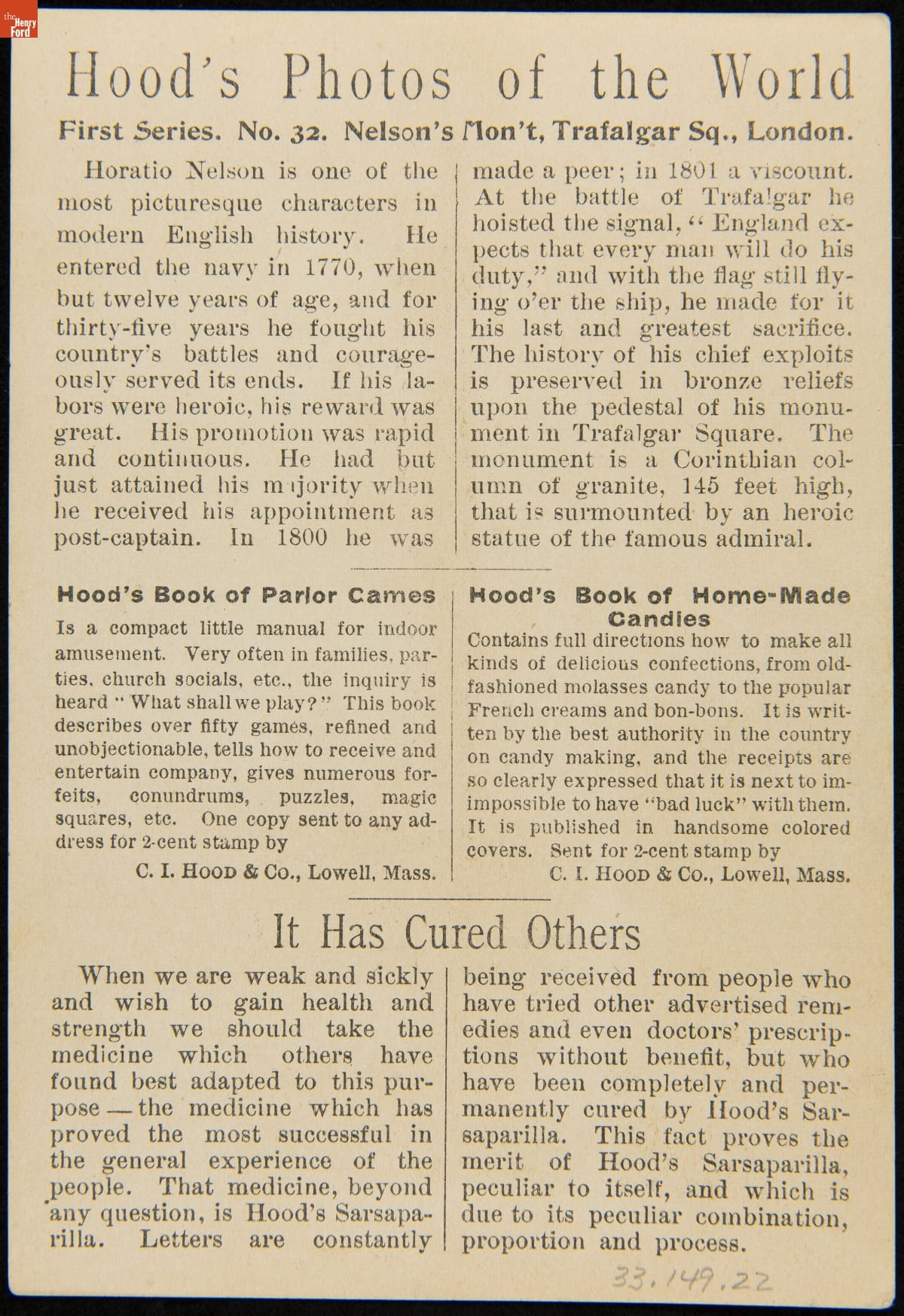 Trade Card for C.I. Hood & Co. with Hood's Photos of the World, "Nelson's Monument, Trafalgar Square, London," 1890-1910