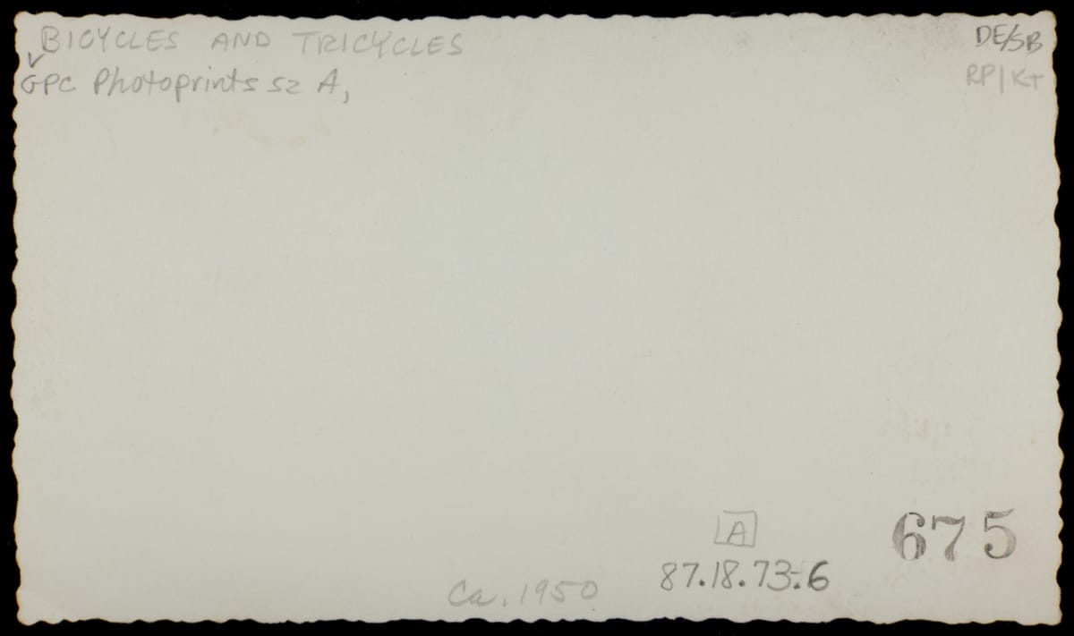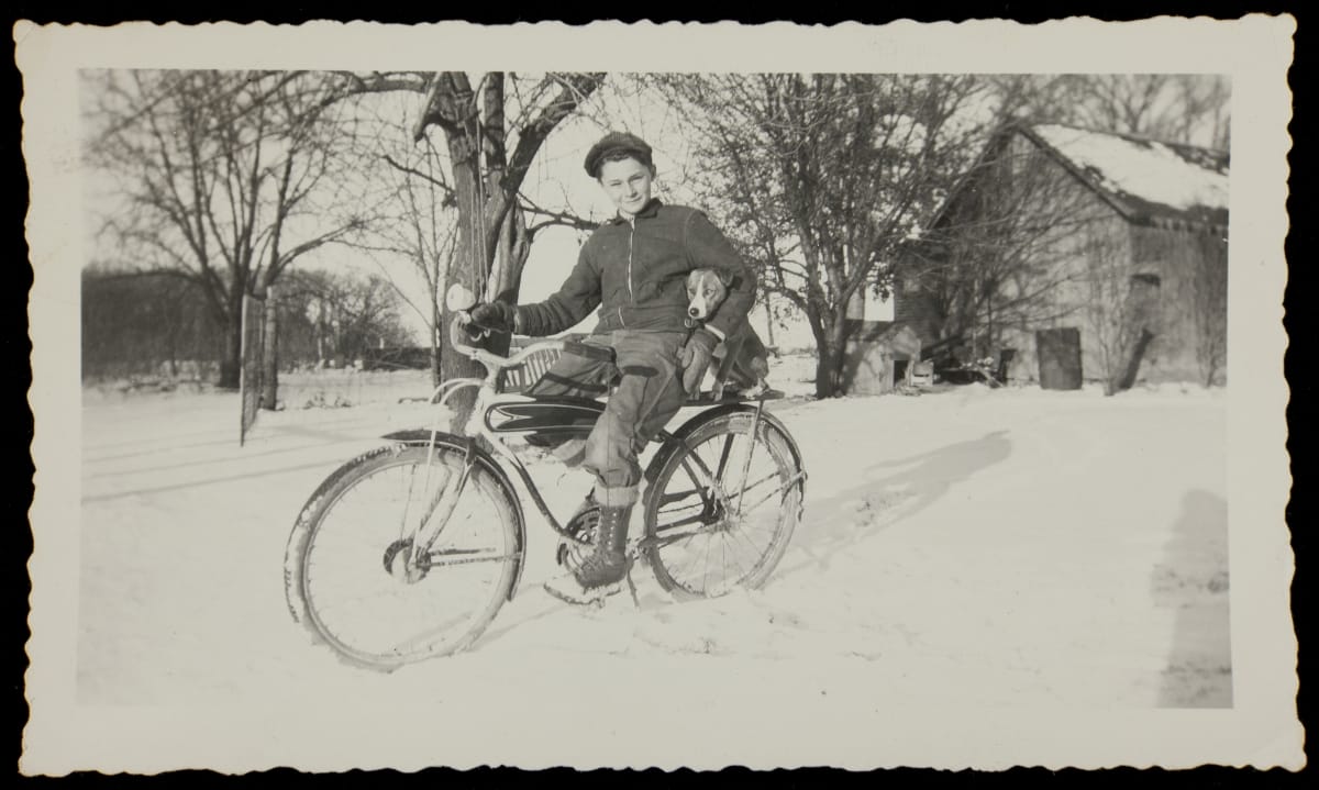 In America during most of the twentieth century, while adults motored around, children pedaled. Kids' bikes were vehicles for doing odd jobs. They also transported children to and from school and around the neighborhood with friends. This photograph from the 1950s shows that a bike could also carry a boy's best friend in any kind of weather.