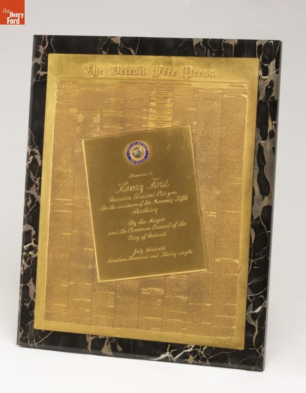 Henry Ford was not only recognized as an automotive industrialist; during his years in the public eye he was recognized by many civic and corporate associations. This plaque, declaring Henry Ford to be "Detroit's Greatest Citizen," was evidently one gift that was personally significant. Accession file notes state that this resided in, and was later recovered, from Mr. Ford's office.