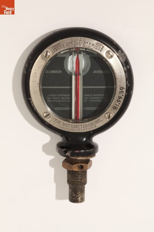 Automobiles often came without temperature gauges before the early 1930s, so enterprising manufacturers sold aftermarket motometers. Mounted on a car's radiator, these devices measured and displayed coolant water vapor temperature, notifying drivers if their automobiles were in danger of overheating. Moto-Meter Co. Inc. dominated the American market, producing the popular Boyce motometer and others featuring an automotive manufacturer's name or logo.
