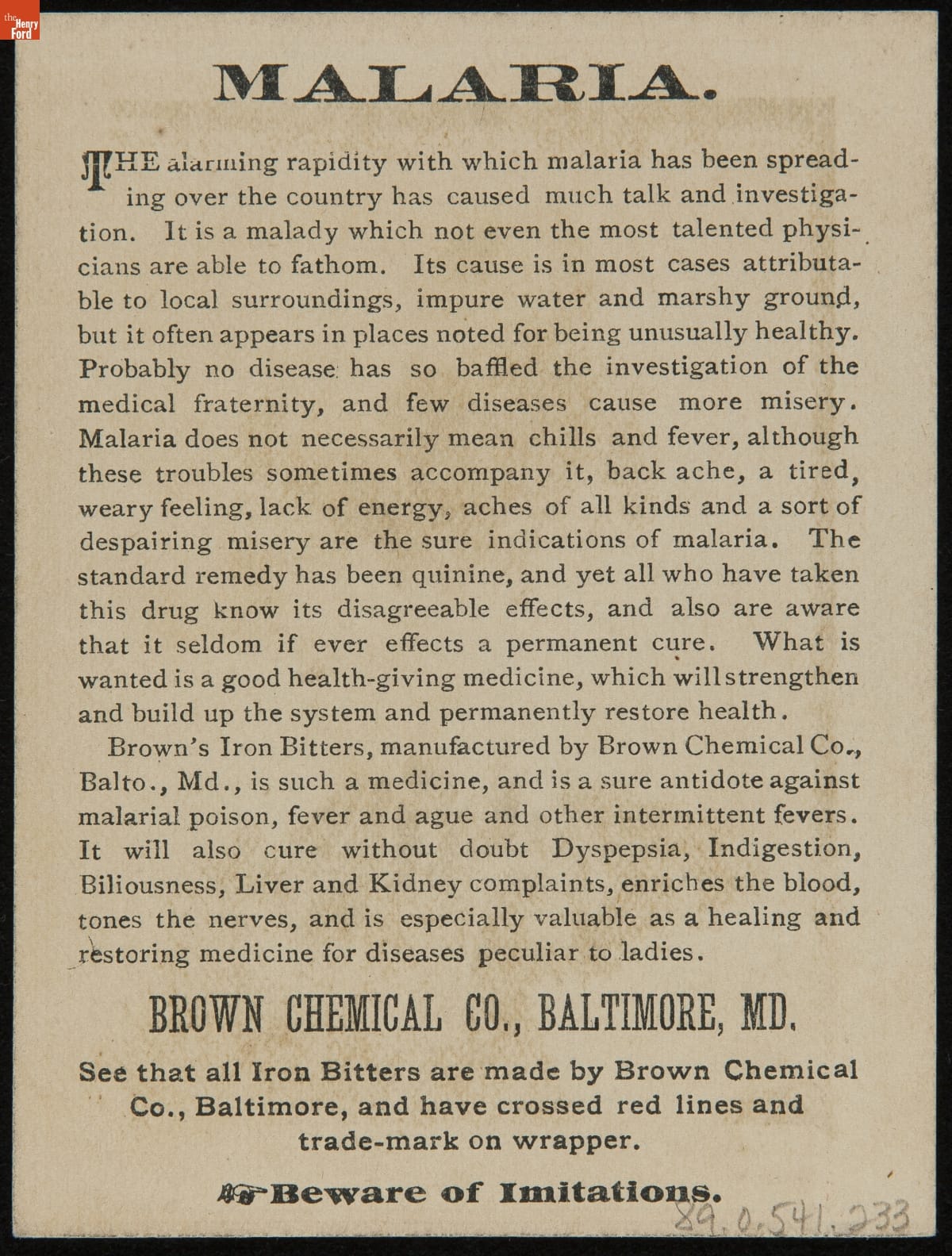 Trade Card for Brown's Iron Bitters, Brown Chemical Co., 1890-1900