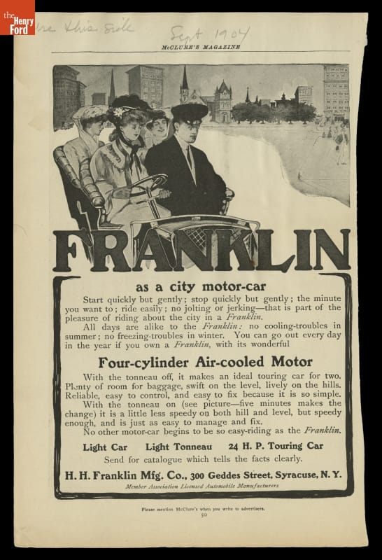 Franklin heralded the versatility of its automobiles in this 1904 advertisement. The tonneau -- a detachable rear seat -- doubled the car's seating in five minutes. The air-cooled motor eliminated the danger of the cooling system boiling over in summer or freezing in winter. According to Franklin, its vehicle was a perfect "city motor-car."