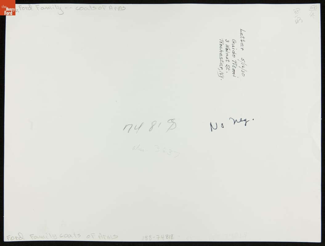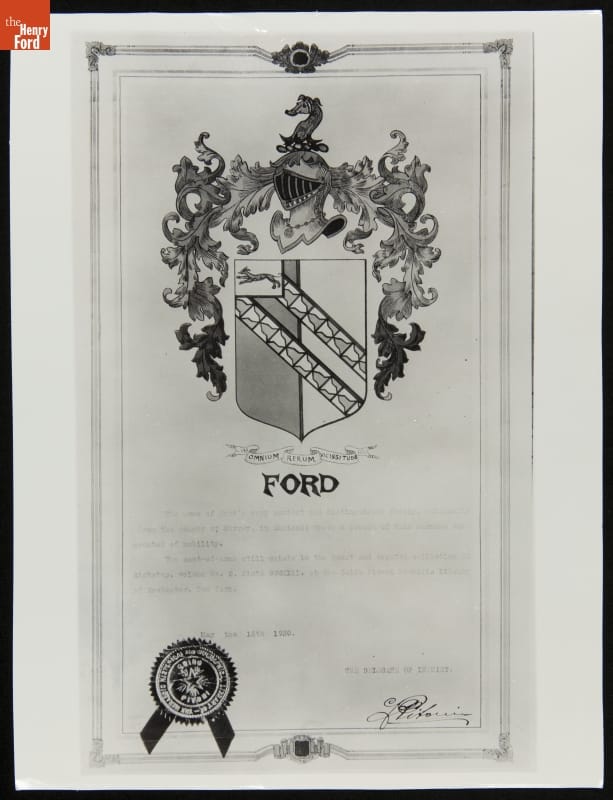 Researchers can turn up interesting material while investigating a family's genealogy. Some of this material, however, may not be relevant to the family history. Researchers hired by Henry Ford in the early 20th century found this coat-of-arms -- along with others -- when tracing his family tree. No connection has been made between Henry Ford's ancestors and this crest.