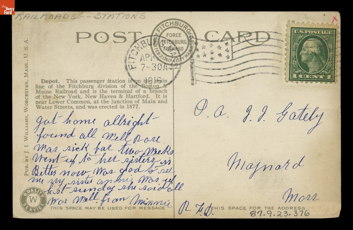 Depot. This passenger station is on the train line of the Fitchburg division of the Boston & Maine Railroad and is the terminal of a branch of the New York, New Haven & Hartford. It is near Lower Common, at the junction of Main and Water Streets, and was erected in 1877.