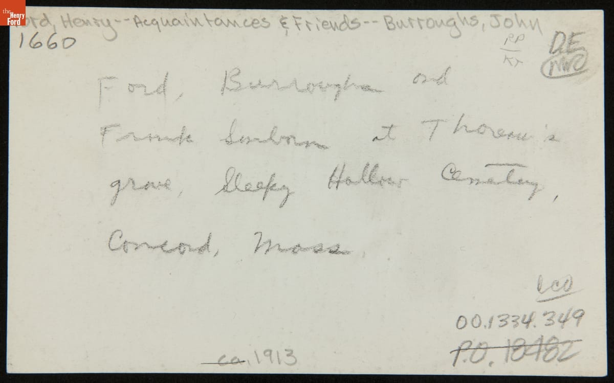 In 1913, naturalist John Burroughs and industrialist Henry Ford visited Concord, Massachusetts, where two of Burroughs's early literary influences -- Ralph Waldo Emerson and Henry David Thoreau -- once resided. Ford, Burroughs and their traveling companions visited Emerson's home, Walden Pond and the gravesites of the two 19th-century Transcendentalists. Frank Sanborn, a Burroughs acquaintance and friend of Emerson and Thoreau, served as guide for the distinguished visitors.