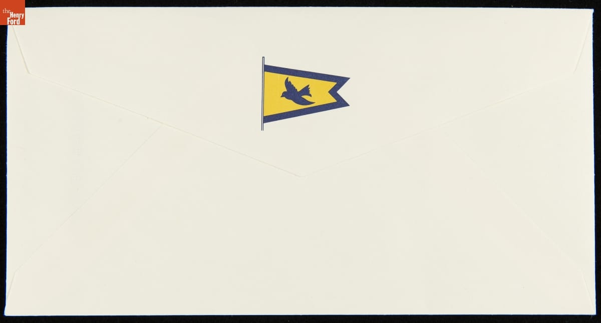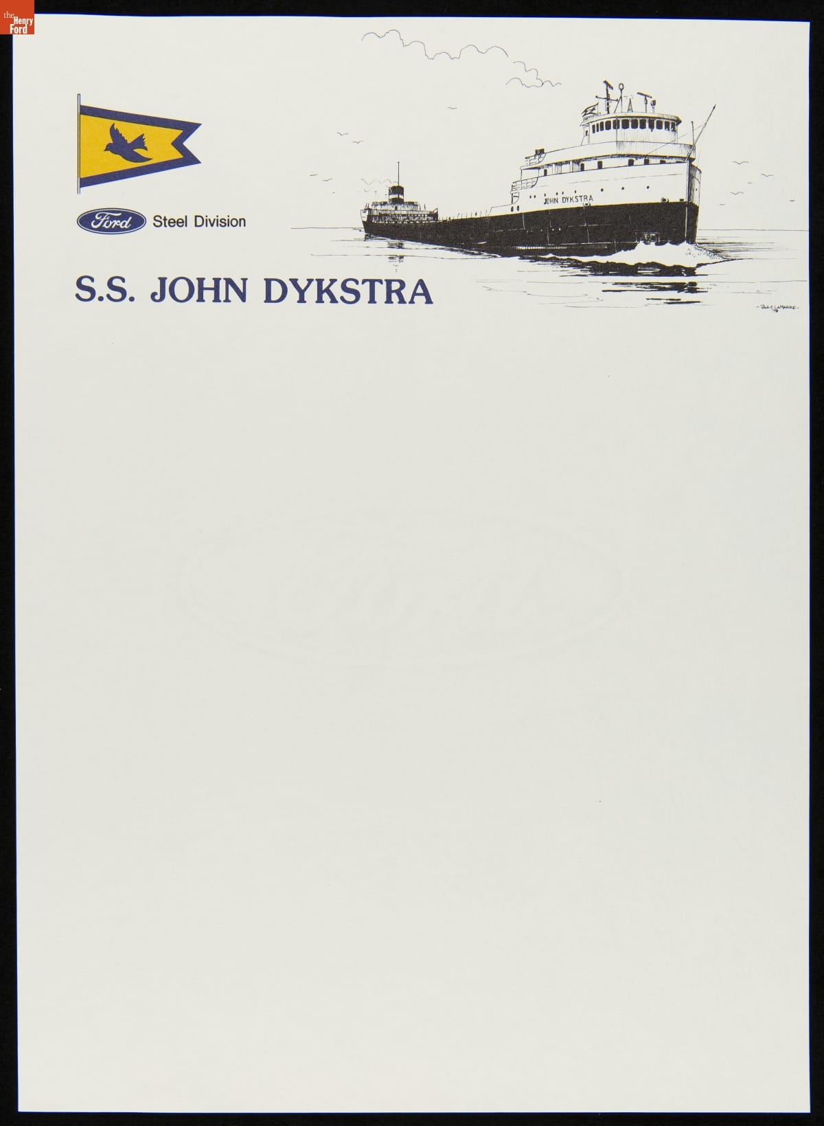 Stationery for the Ford Motor Company's ore carrier John Dykstra contains images of the freighter, the Ford logo, and the house flag flown when the ship was underway. The flag depicts a bluebird -- a favorite of Henry Ford, an amateur birdwatcher. The Dykstra, named for a past president of Ford, hauled raw material to Ford's River Rouge factory near Detroit, Michigan.