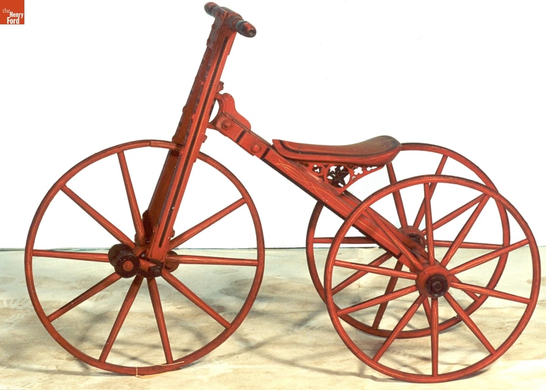 A number of three-wheeled vehicles designed specifically for children were introduced during the last decades of the 19th century. This version, with its large front wheel with attached pedals and two smaller rear wheels, was called a velocipede. By the mid-20th century, all three-wheeled children's vehicles came to be known as tricycles.