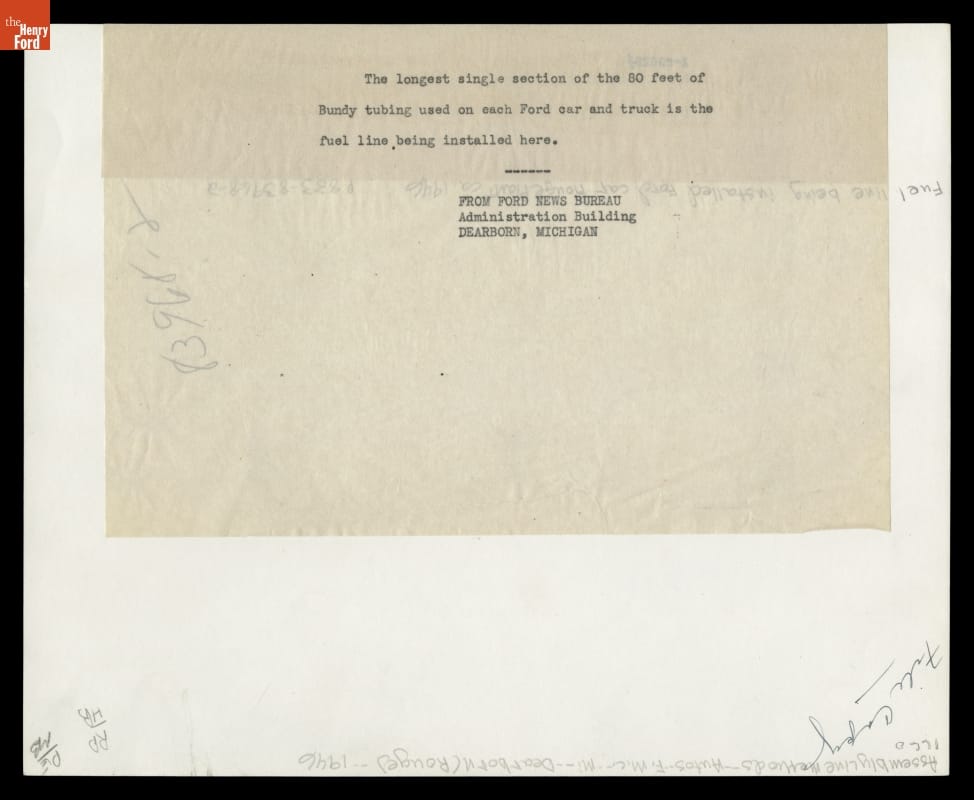The longest single section of the 80 feet of Bundy tubing used on each Ford car and truck is the fuel line being installed here. FROM FORD NEWS BUREAU Administration Building DEARBORN, MICHIGAN