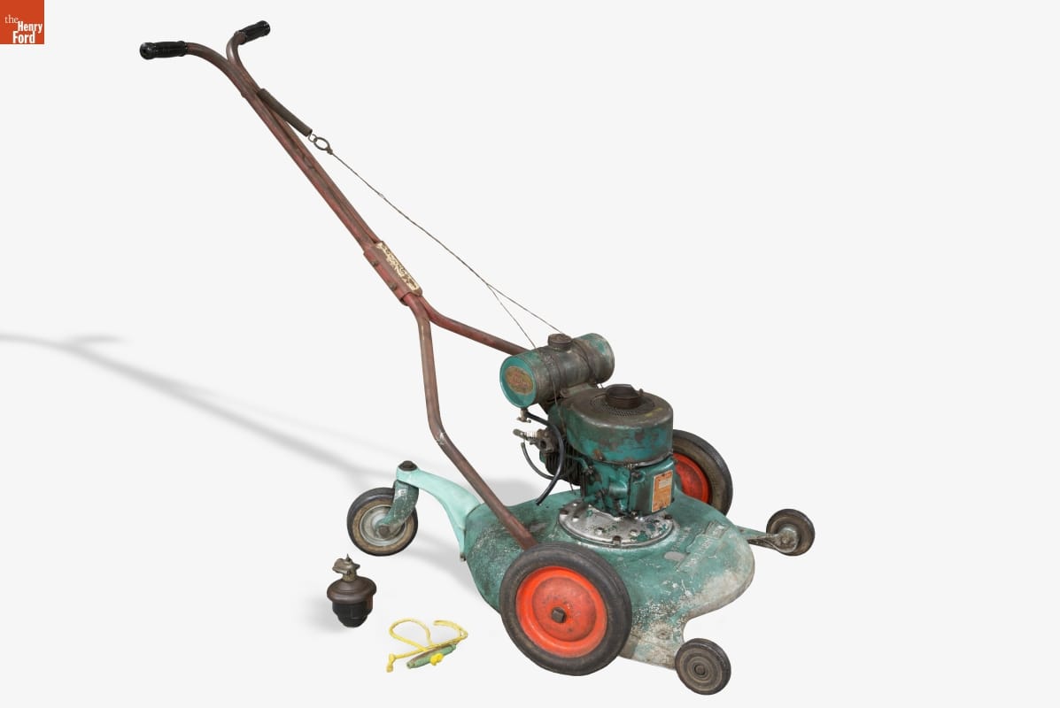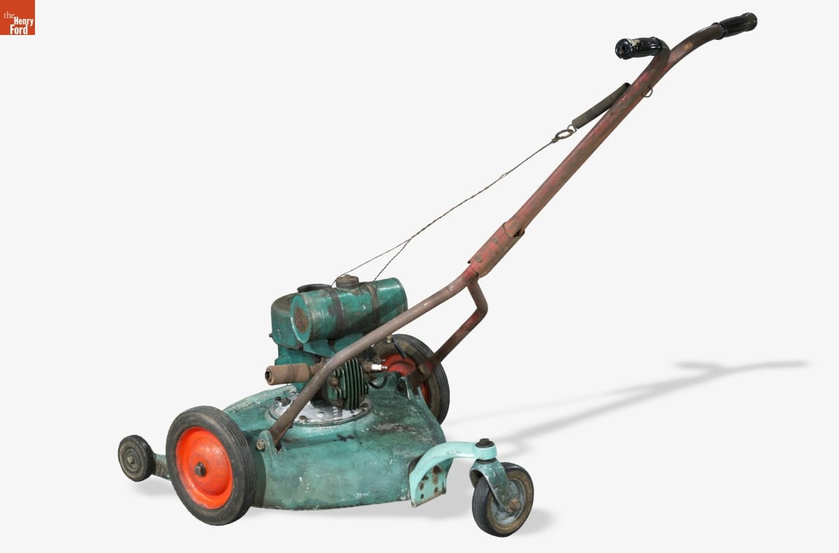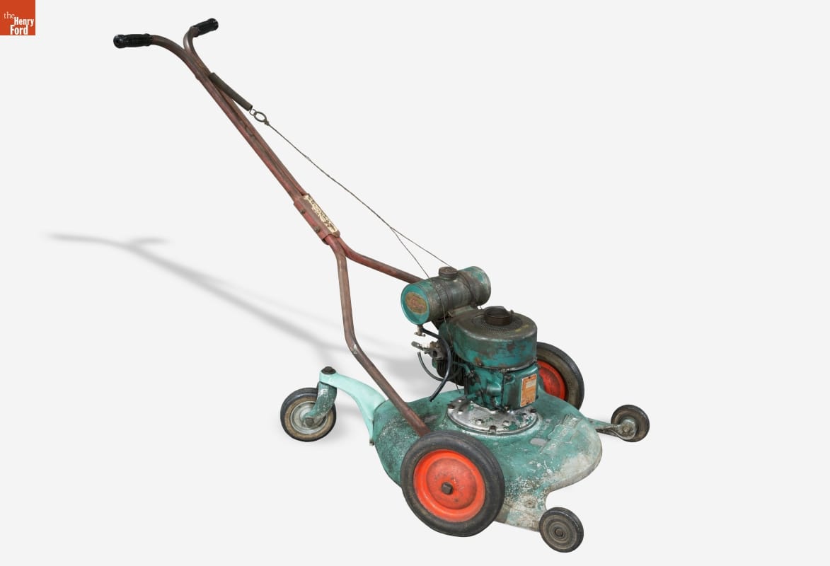 With the rise of the suburban neighborhood at the end of the 19th century, and its continued growth in the decades that followed, maintaining a "perfect" lawn became the new standard. Manufacturers promoted a whole set of specialty equipment to support this American obsession. This fashionable mower, sold through Montgomery Ward, featured a rear wheel that helped operators turn with ease.