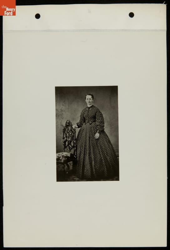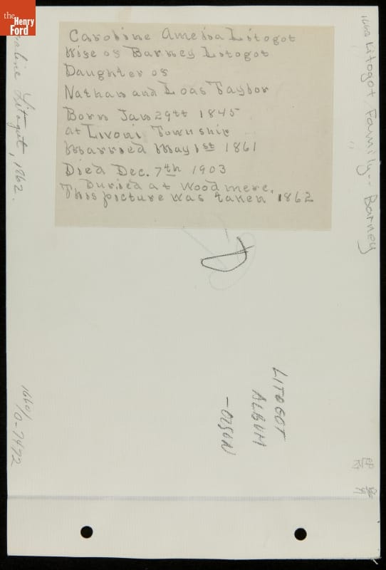 Caroline Amelia Taylor married Barney Litogot in Huron, Michigan, in May 1861. Barney Litogot was the brother of Henry Ford's mother, Mary. At the time of this portrait, Barney was serving in the Union army. In 1873, Barney was appointed keeper of the lighthouse on Mamajuda Island in the Detroit River. When Barney died later that year, Caroline remained as lighthouse keeper and served until 1885.