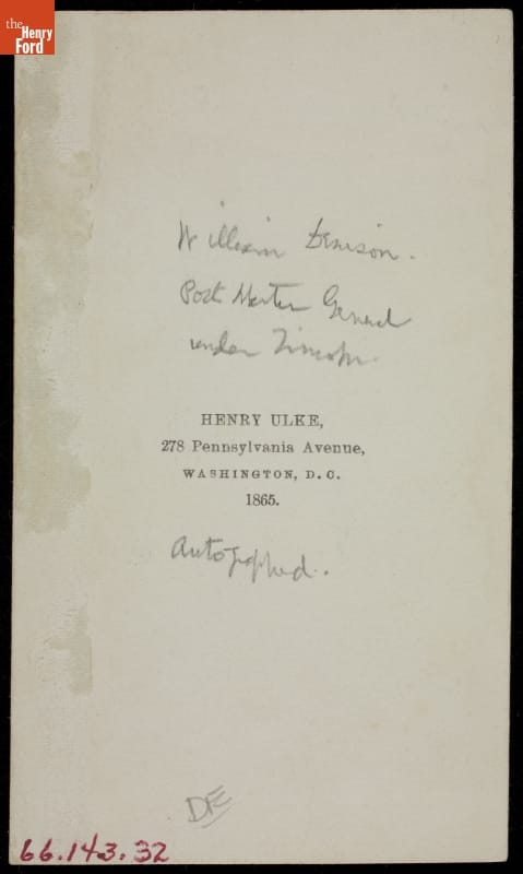 Cartes-de-visite, small, professionally made photographs on cardboard stock, remained popular in the United States from the Civil War in the 1860s through the 1880s. Many were given to friends and loved ones, but enterprising photographers also produced images of famous individuals to sell to the collecting-crazed public. Celebrities, military officers and politicians, such as William Dennison, Abraham Lincoln's second postmaster general, were popular subjects.