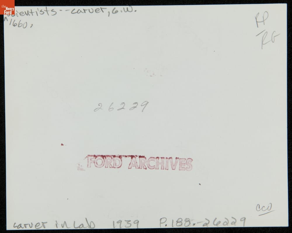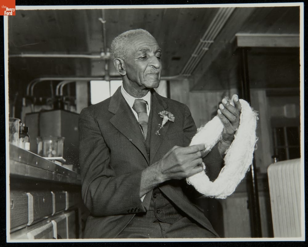 A mutual interest in industrial products made from plants brought Henry Ford and the scientist George Washington Carver together as colleagues and friends. Ford developed plastics and fibers from soybeans. Here, on a 1939 visit to Dearborn, George Washington Carver is seated in the Soybean Laboratory in Greenfield Village, holding a skein of soy fiber in his hands.