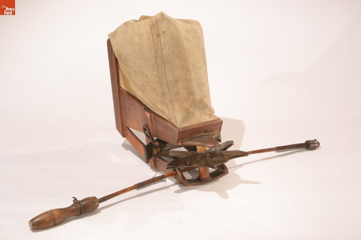 The hand-cranked spinning disk of a broadcast seeder distributes grass and grain seed quickly to a wide area -- an improvement over tossing out seed by hand. By the time this seeder was made, it would have been used on smaller farms or to plant less critical crops. Larger, wealthier farms employed seed drills, which placed the seed into the ground.