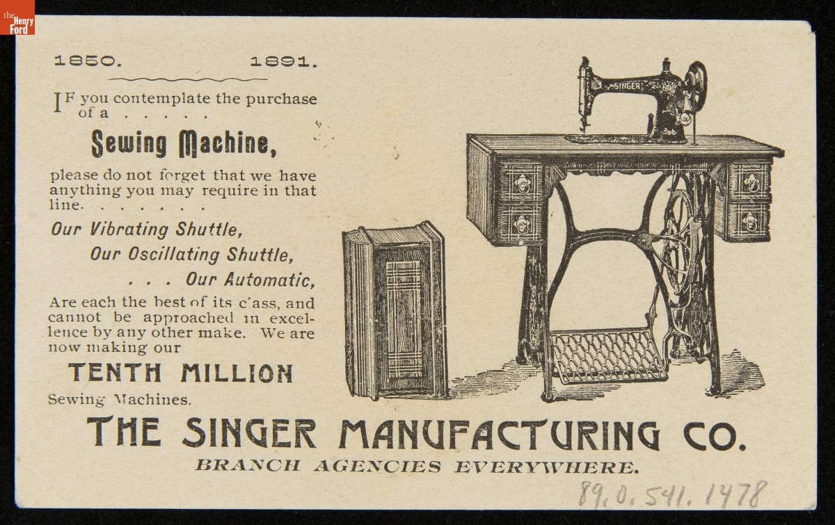 As color printing gained momentum in the late 19th century, trade cards became a major means of advertising goods and services. The Singer Sewing Machine Company -- founded when Isaac Singer introduced the first practical sewing machine for home use in 1851 -- embraced this method of advertising. The Singer Company produced colorful trade cards, like this one, which informed customers about popular sewing machine.