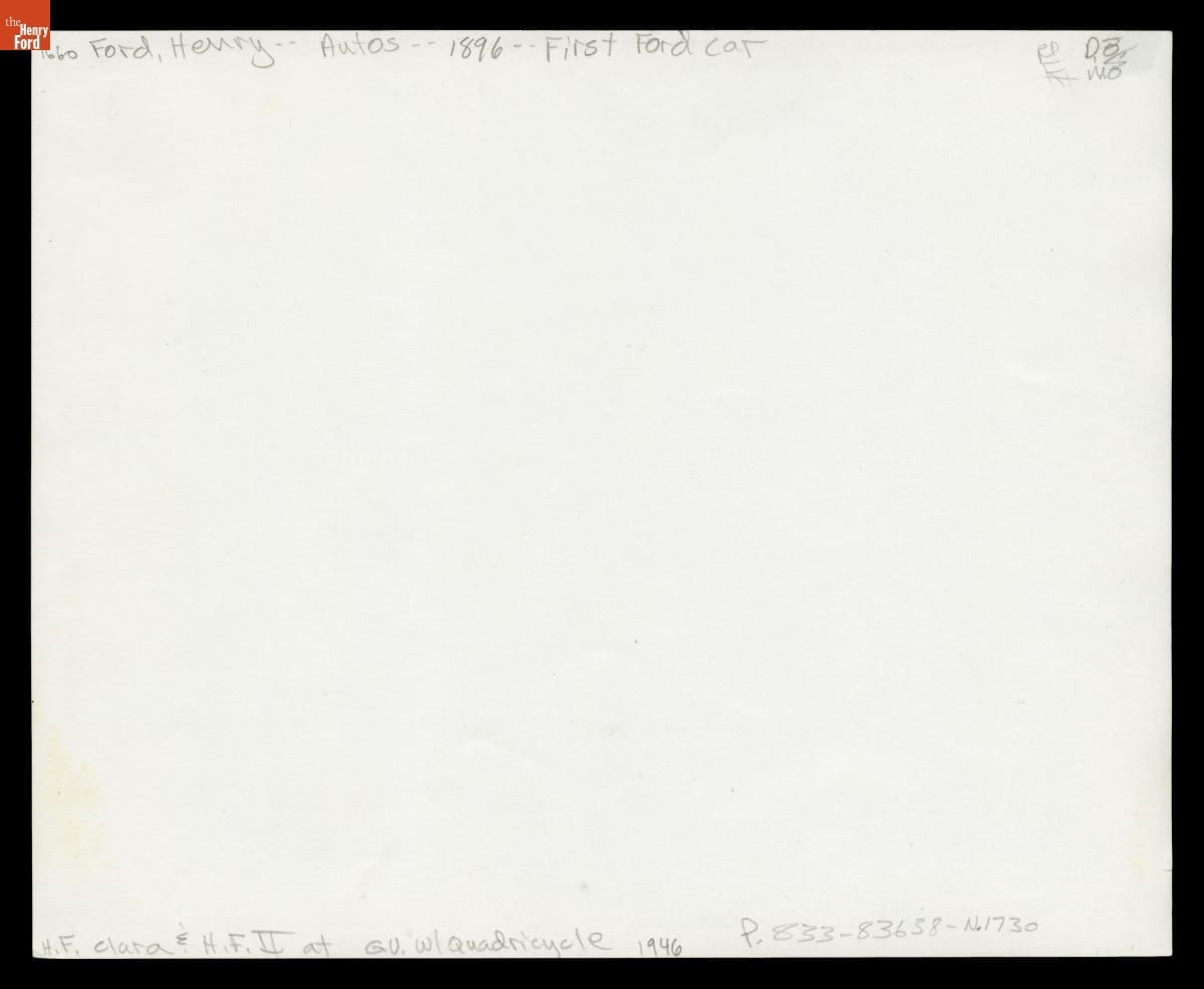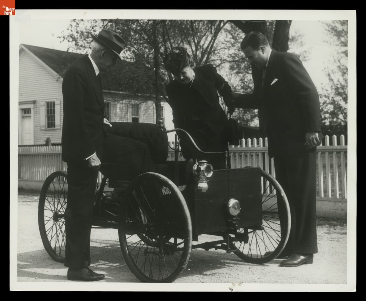 Henry Ford II helped his grandparents, Henry and Clara Ford, into the 1896 Quadricycle in Greenfield Village in May 1946. The occasion was the "Automobile Golden Jubilee," Detroit's celebration of the auto's 50th anniversary in the city. Henry Ford's Quadricycle, which he first operated in June 1896, was only the second automobile driven in the Motor City.