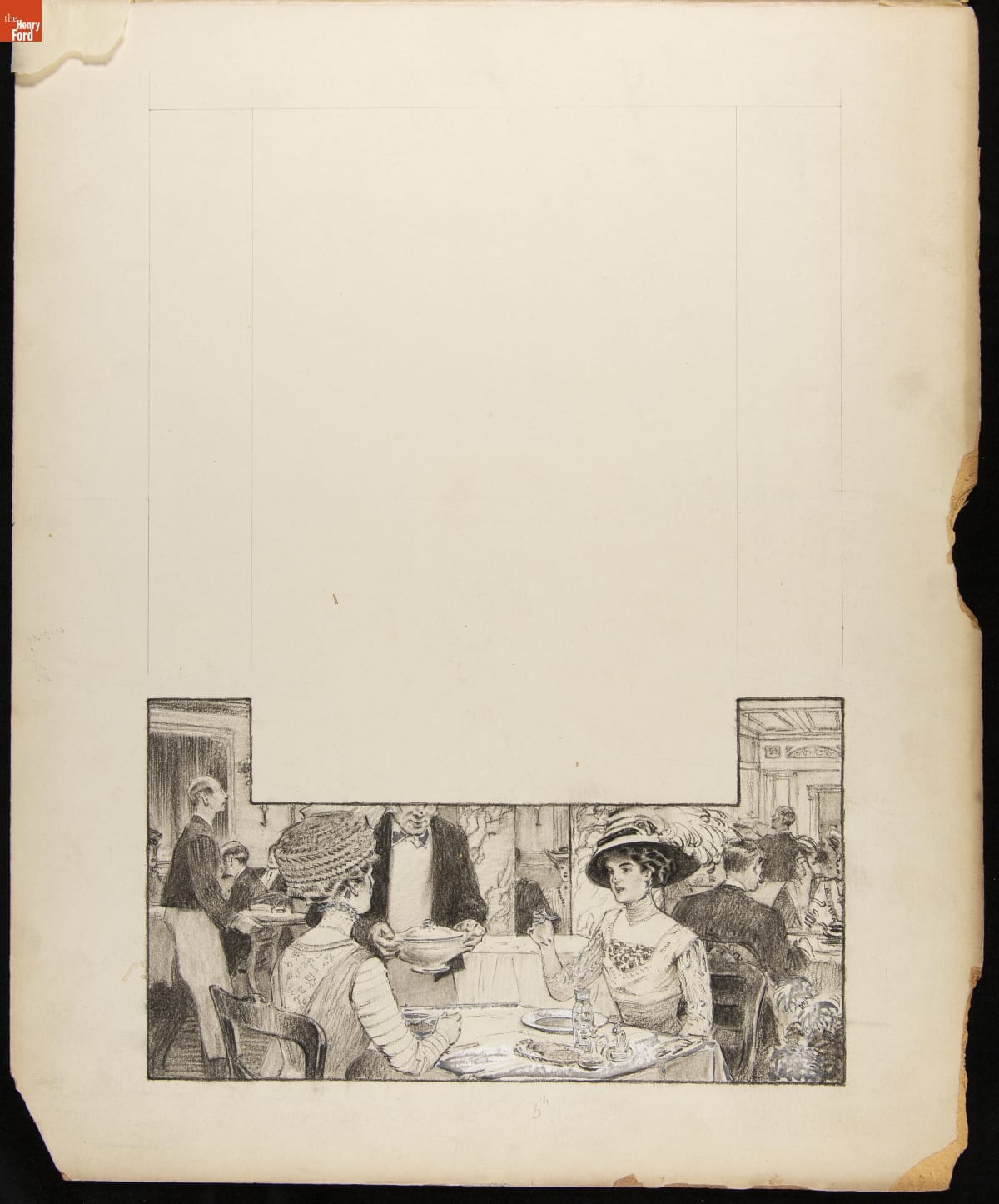 Advertising Layout Drawing of Women Dining in a Restaurant, September 20, 1909