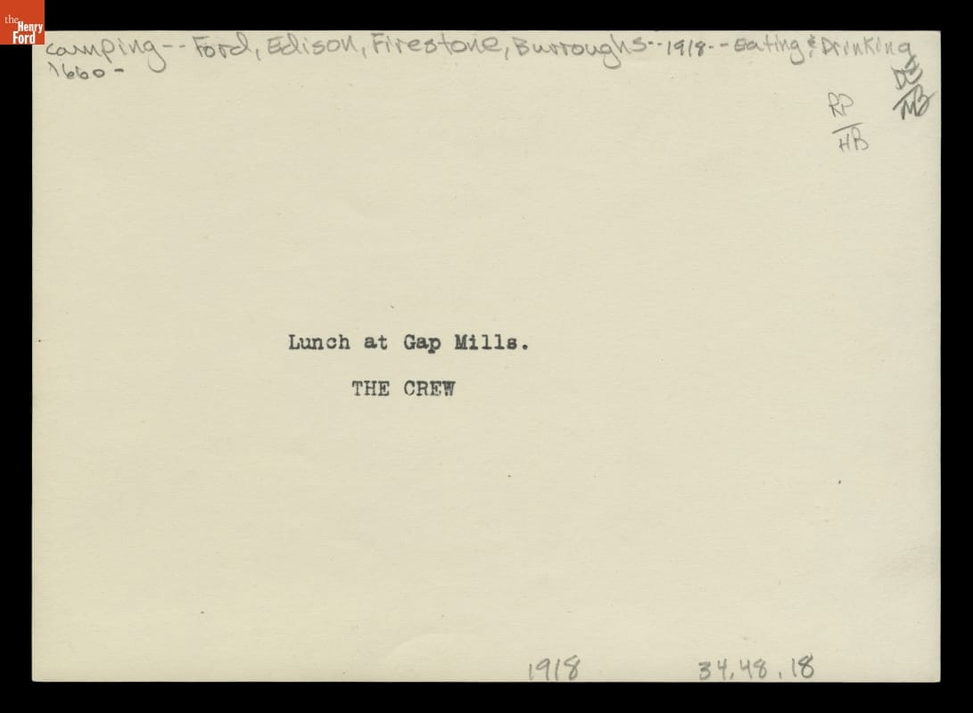 Between 1916 and 1924, Henry Ford, Thomas Edison, Harvey Firestone, and John Burroughs embarked on a series of camping trips. They called themselves the Vagabonds, but they camped in style. Numerous support staff set up and took down camp, cooked, took photographs, and maintained the cars and equipment trucks. This candid photograph shows the staff relaxing and eating lunch by a creek in West Virginia.