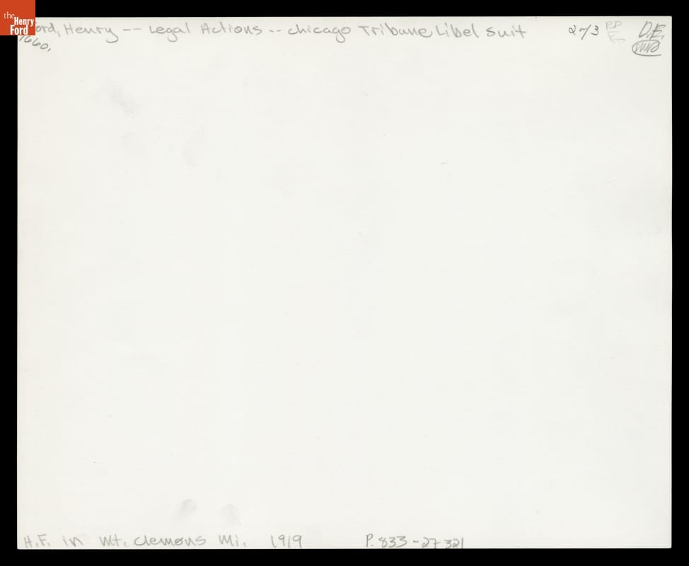 When Henry Ford sued the Chicago Tribune for libel, the million-dollar lawsuit made national headlines. Ford's shaky court testimony, in which he mangled basic American history facts, shocked lawyers but further endeared him to working people. The trial took place in 1919 at Mount Clemens, Michigan, 25 miles northeast of Detroit. The jury found for Ford but awarded him just six cents.