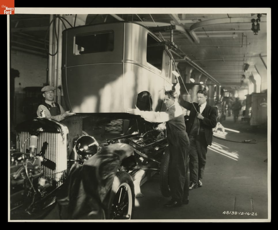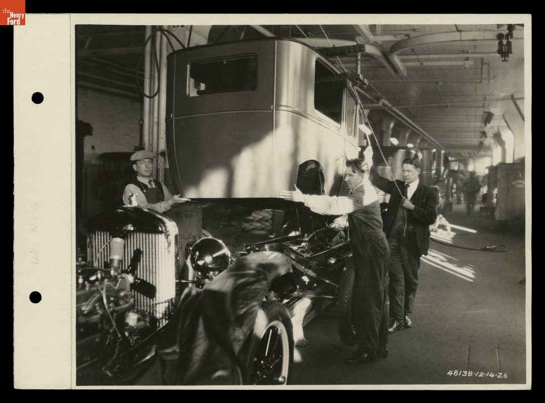 Ford Model T Assembly Line, Body Drop onto Chassis, Highland Park Plant, 1926