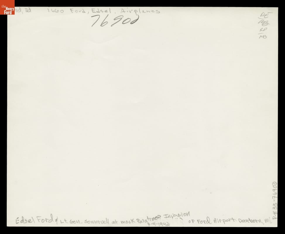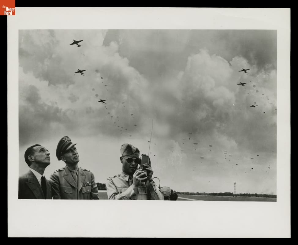 Edsel Ford and Lieutenant General Somervell Watching Demonstration of Paratroop Jumping at Ford Airport, July 4, 1942