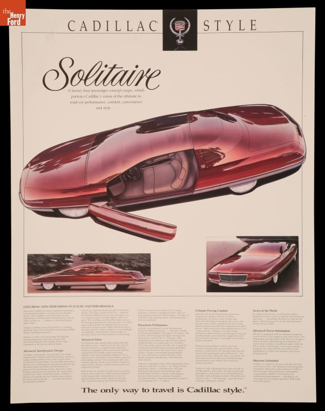 Cadillac debuted its Solitaire concept car at the 1989 North American International Auto Show in Detroit. The two-door luxury vehicle featured motorized doors, heated massage seats, and video cameras and LCD screens that took the place of conventional rear- and side-view mirrors. The Solitaire's 430-horsepower, fuel-injected V-12 engine offered performance to match the car's sleek exterior.