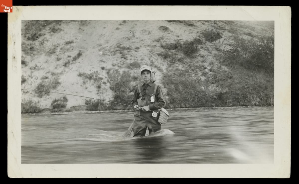 Edsel Ford was photographed while fly fishing about 1915. One of his personal highlights that year was the cross-country road trip he took with six of his friends. Ford and his companions trekked 2,400 miles from Detroit to San Francisco, traveling in a Ford Model T, a Cadillac and a Stutz.