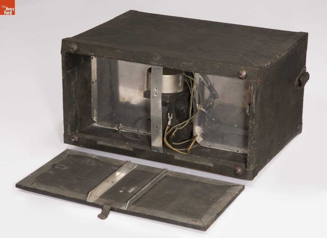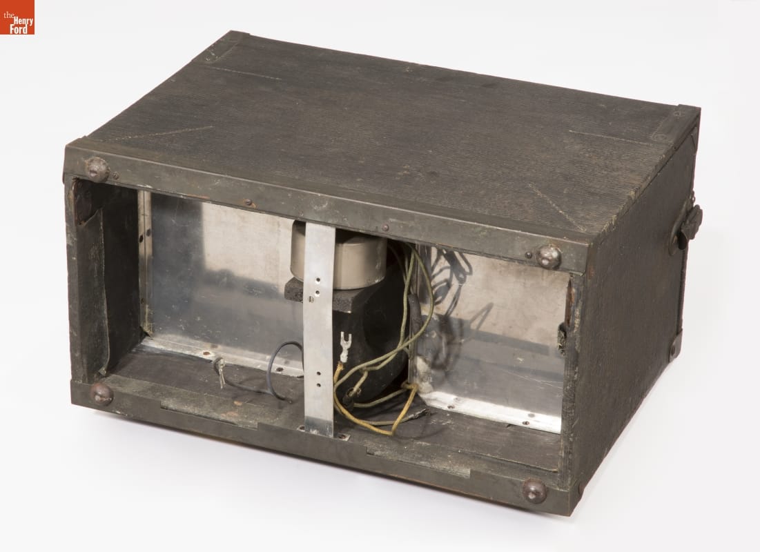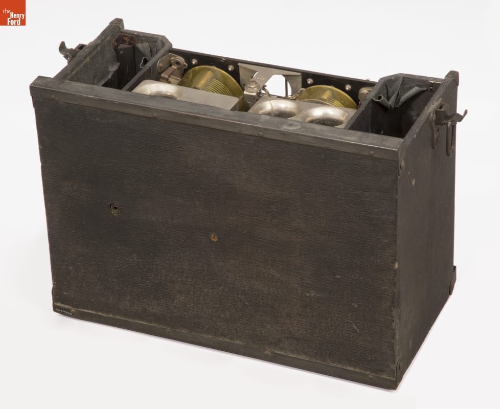 The Operadio 2 was among the first generation of commercial portable radios. While a "mobile" device weighing 30 pounds may be laughable to us now, the Operadio was a groundbreaking device. A self-contained system, its carrying case conceals batteries, a speaker horn--and a loop antenna in the lid that attaches to the top, where it swivels for better reception.