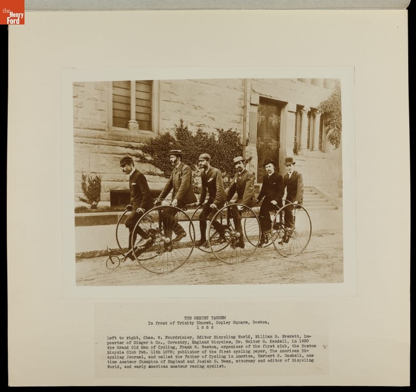 Six men pedal a sextet tandem down the streets of Boston, Massachusetts, in 1886. These cycling enthusiasts included local bicycle club members, racers, magazine editors, and bicycle merchants. Large high-wheel bicycles tended to be the preferred mode of transportation among this group and this jaunt probably was taken to promote the benefits of cycling to the general public.