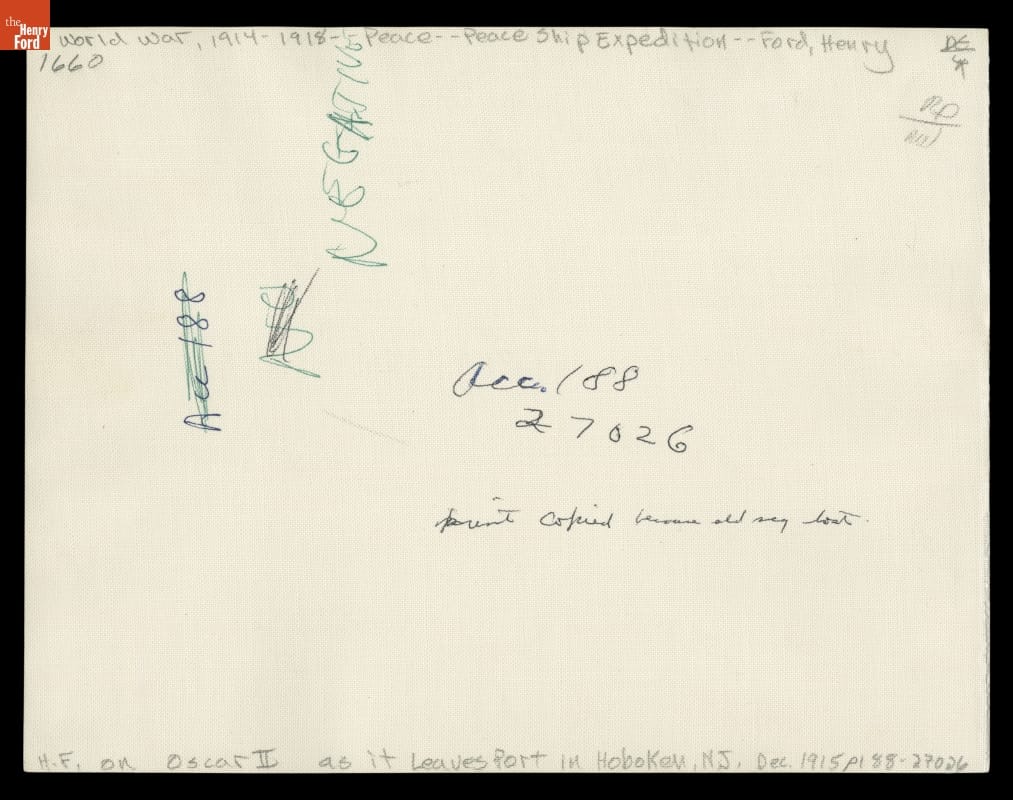 Henry Ford aboard the Peace Ship "Oscar II," Leaving Hoboken, New Jersey, 1915