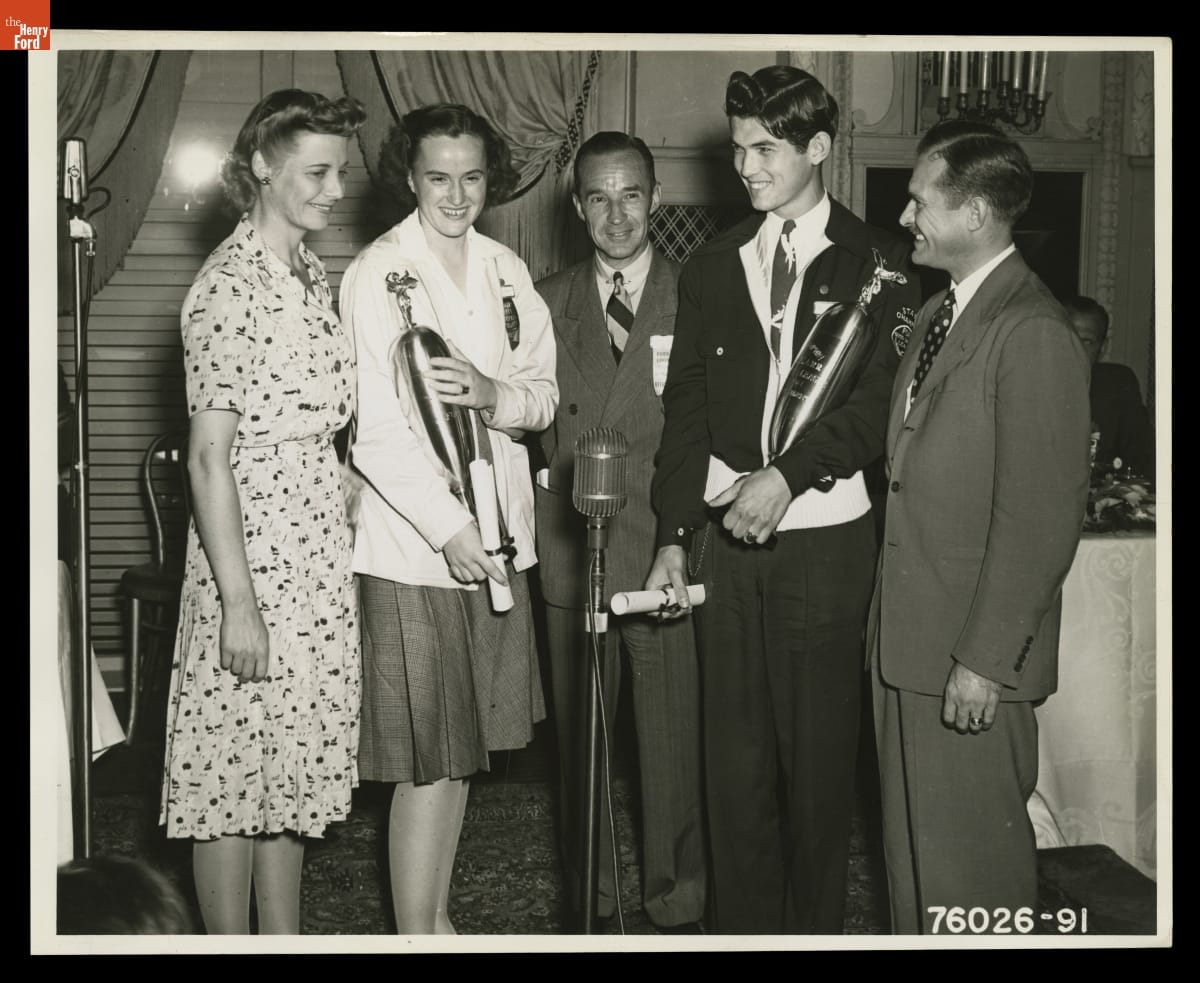 Ford Motor Company created the Good Drivers League in 1940 to promote safe driving habits among high school students. In 1941, boys and girls from 48 states and the District of Columbia came to Dearborn, Michigan, to compete for scholarships and trophies. National champions Patricia Borman and Kenneth Karr stand with Edsel Ford (center), tennis champion Alice Marble, and Indianapolis 500 winner Wilbur Shaw.