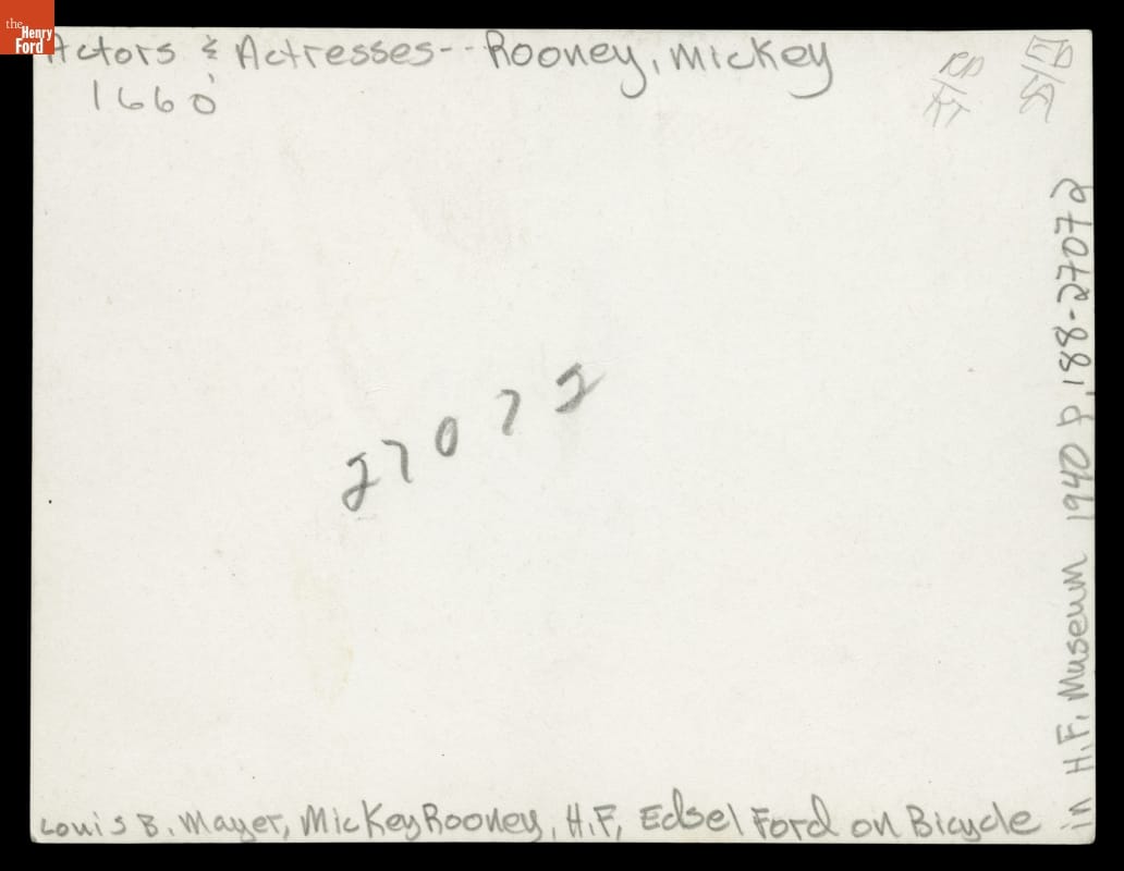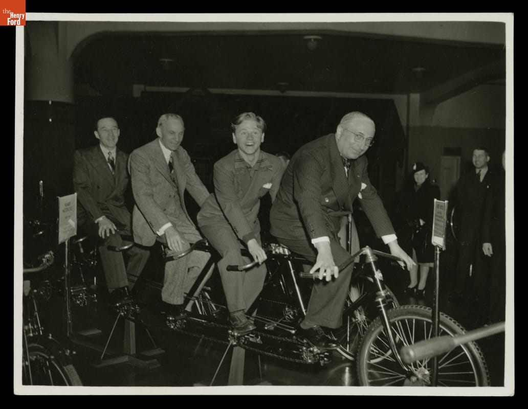 Edsel Ford, Henry Ford, Mickey Rooney and Louis B. Mayer on the 10-Man Orient "Oriten" Bicycle in Henry Ford Museum, 1940
