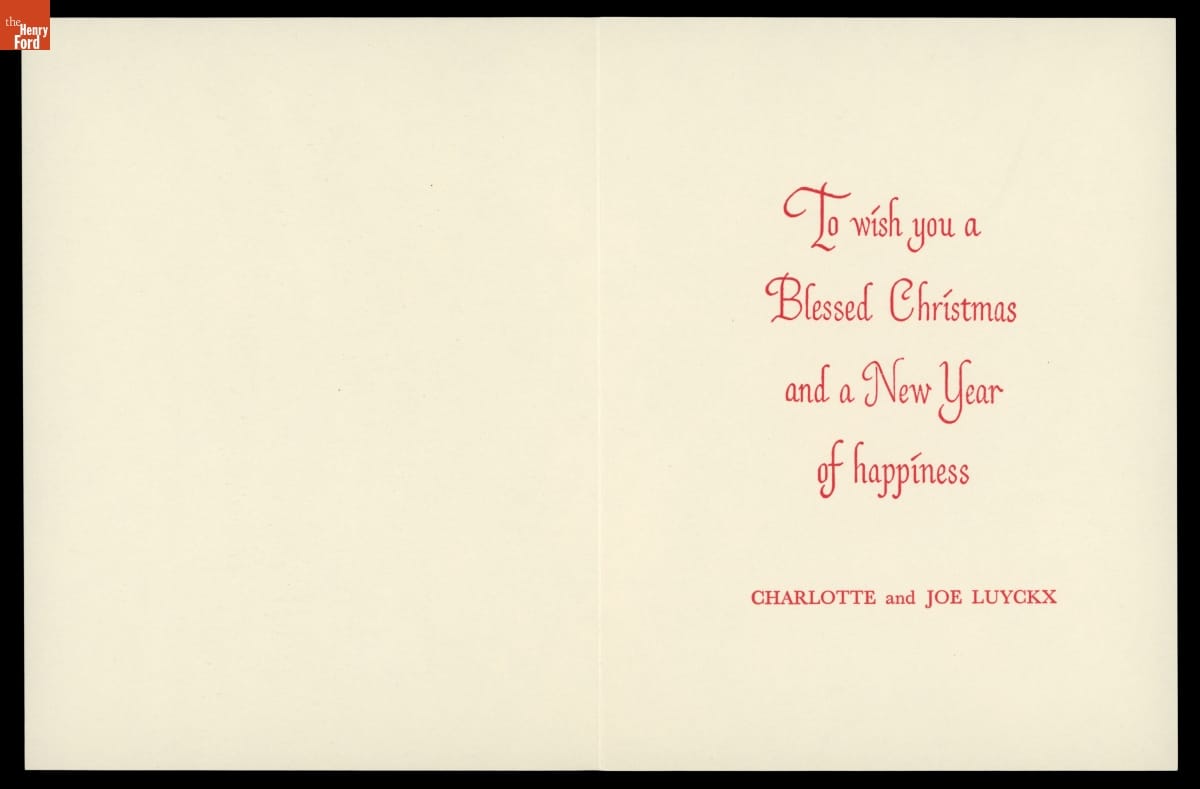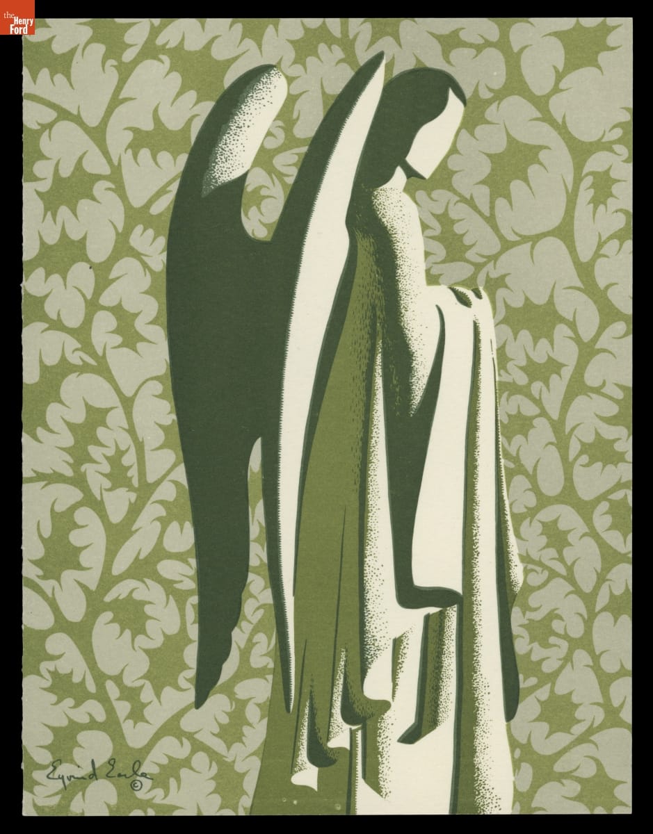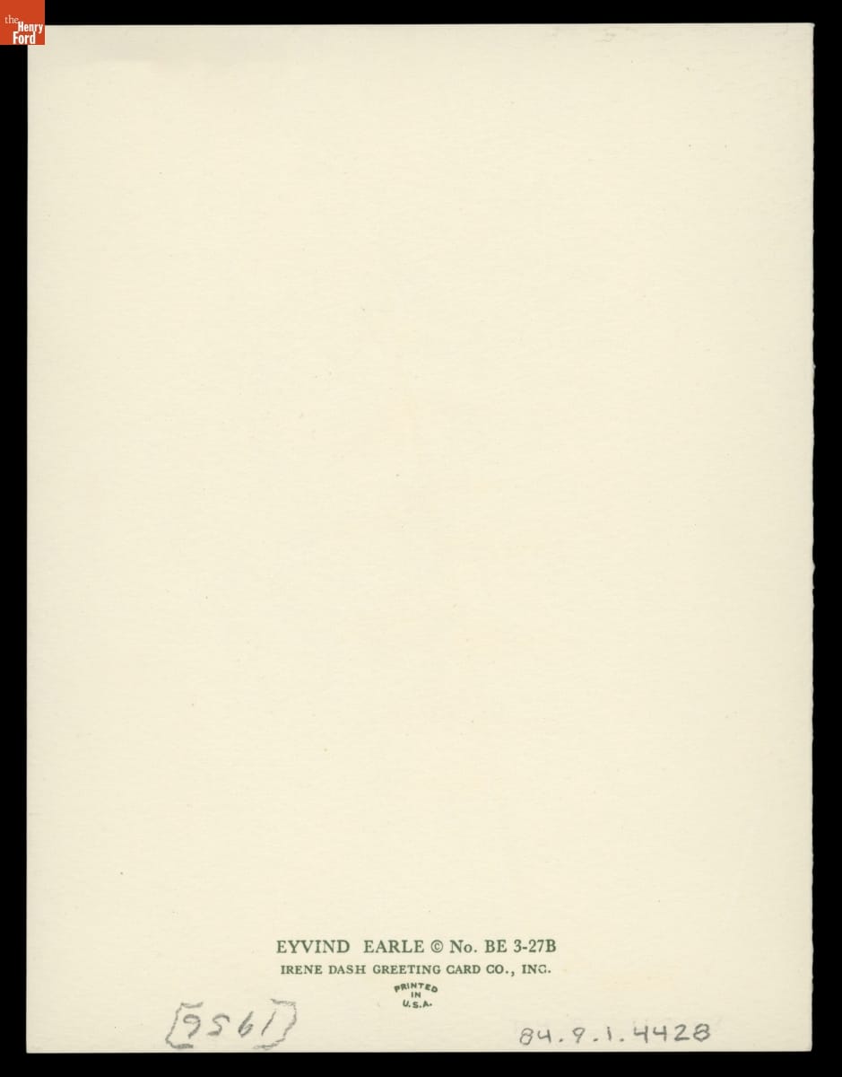 The artist Eyvind Earle (1916-2000) is best known for his work on the 1959 Walt Disney Studios animated film Sleeping Beauty, but he also designed Christmas cards. Earle began producing cards in his early twenties, selling them through his own company. Later, Earle joined the American Artists Group and continued designing Christmas cards. He would produce more than 800 designs throughout his career.