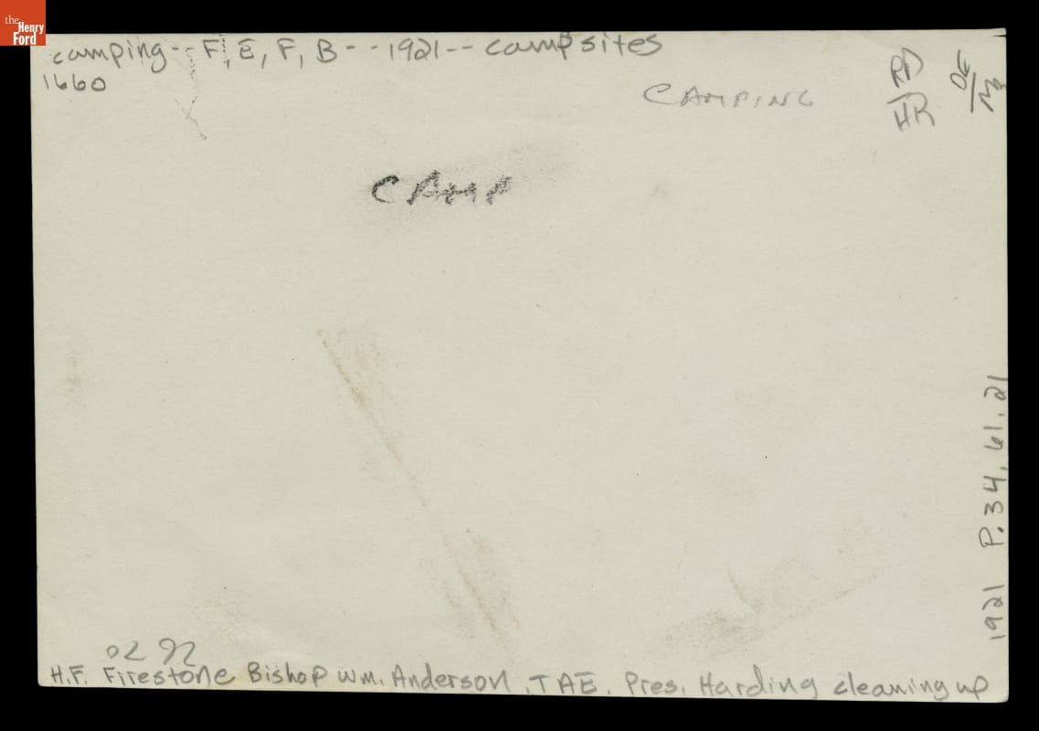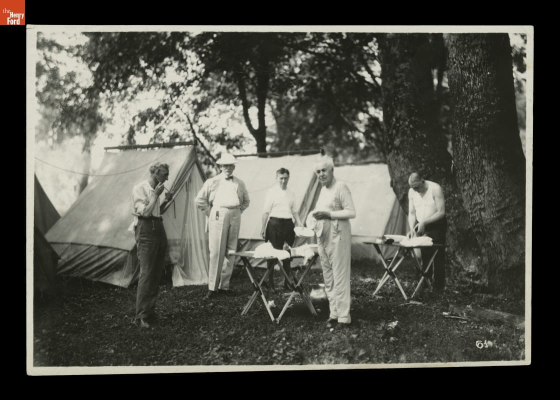 Thomas Edison, Henry Ford, and Harvey Firestone, part of the self-proclaimed Vagabonds, are shown shaving and washing up during their 1921 camping trip. They are joined by Bishop William Anderson and President Harding. Newsmen and photographers documented and reported the Vagabonds' every move. It's hard to tell how many "informal" activities were staged for reporters.