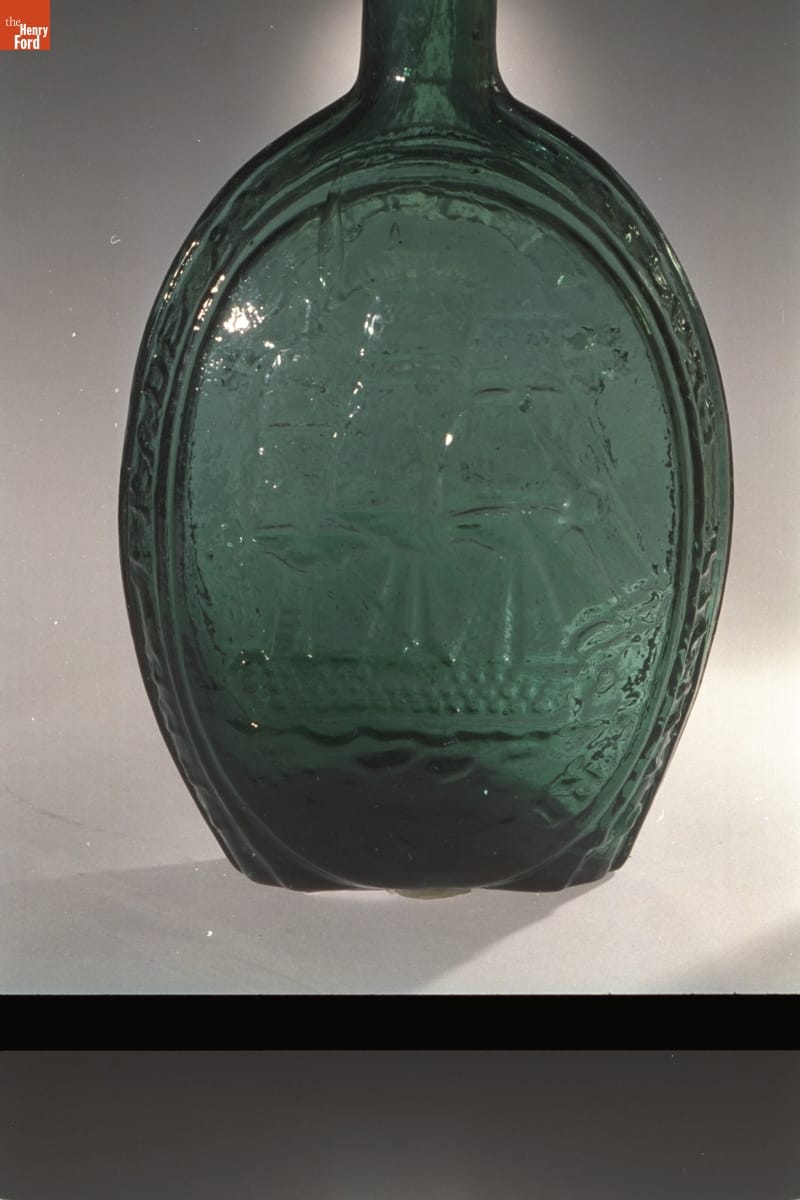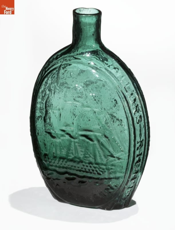 Glass factories in America began producing inexpensive, mold-formed flasks in the early 1800s. These figured flasks, often decorated with phrases and symbols of national pride, appealed to the common man. The U. S. frigate Franklin and the War of 1812 slogan "Free Trade and Sailor's Rights" adorn this 1820s flask. Americans continued to use this patriotic slogan throughout the 19th century.