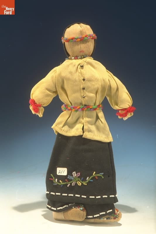 Native Americans were the first to create cornhusk dolls. Most tribes used the dolls as toys for children. Some also used cornhusk dolls in religious ceremonies. During the Craft Revival beginning in the early 1900s, cornhusk dolls became popular again. Native Americans may have made this doll to sell to tourists. Her clothing and shoes are trimmed with beads.