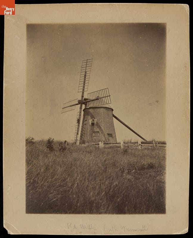 Since the early 1600s, Americans have built windmills to grind grain, pump water, drive machinery and generate power. The European-style windmill seen in this photograph was probably located along the Massachusetts seashore. Wind power drove the grain grinding machinery inside. Mill owners could position the mill's sails to catch the ocean breeze by moving the tail pole to turn the rotating cap.