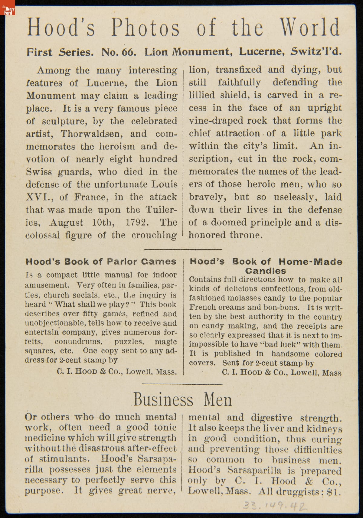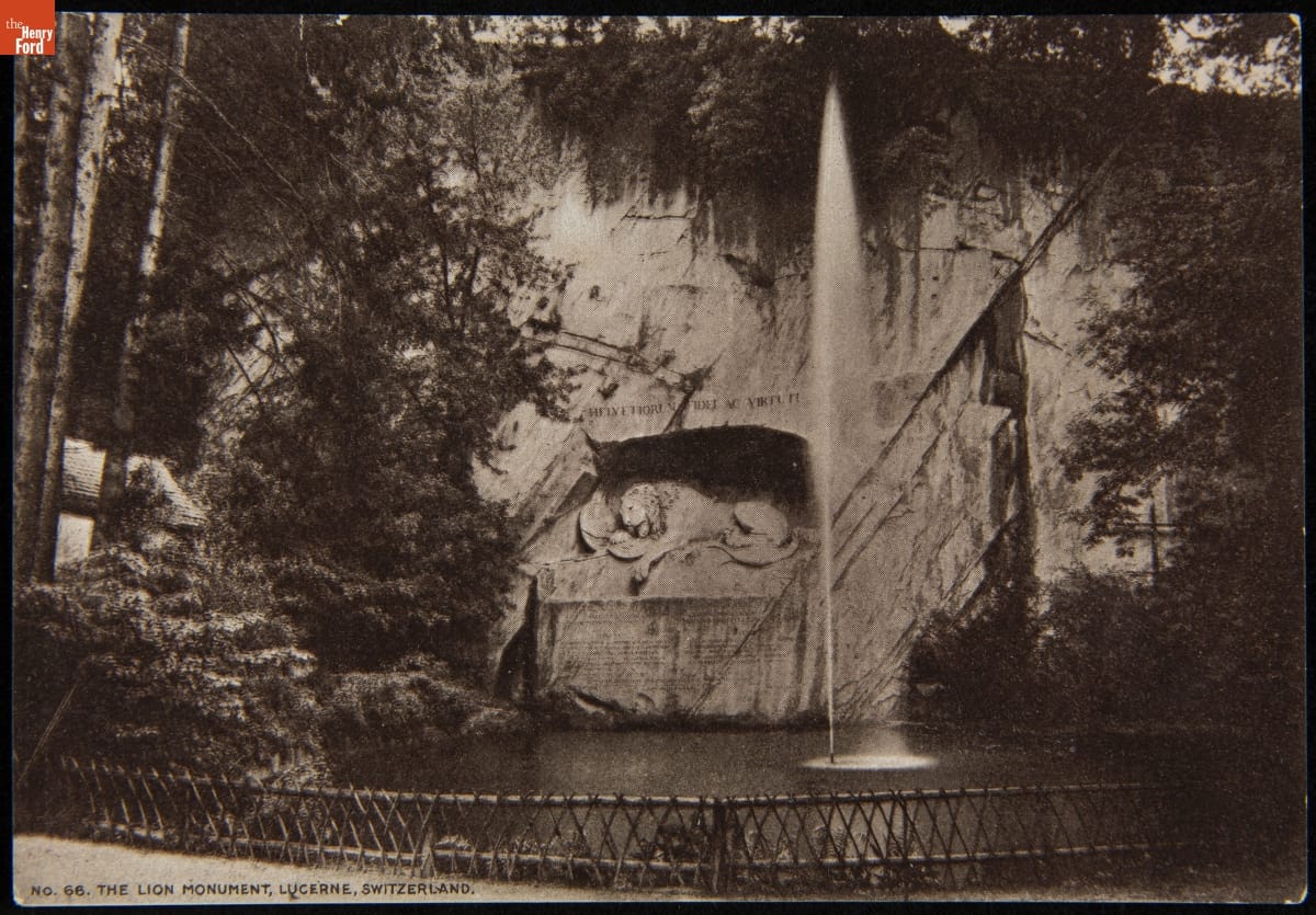 Trade Card for C.I. Hood & Co. with Hood's Photos of the World, "Lion Monument, Lucerne, Switzerland," 1890-1910