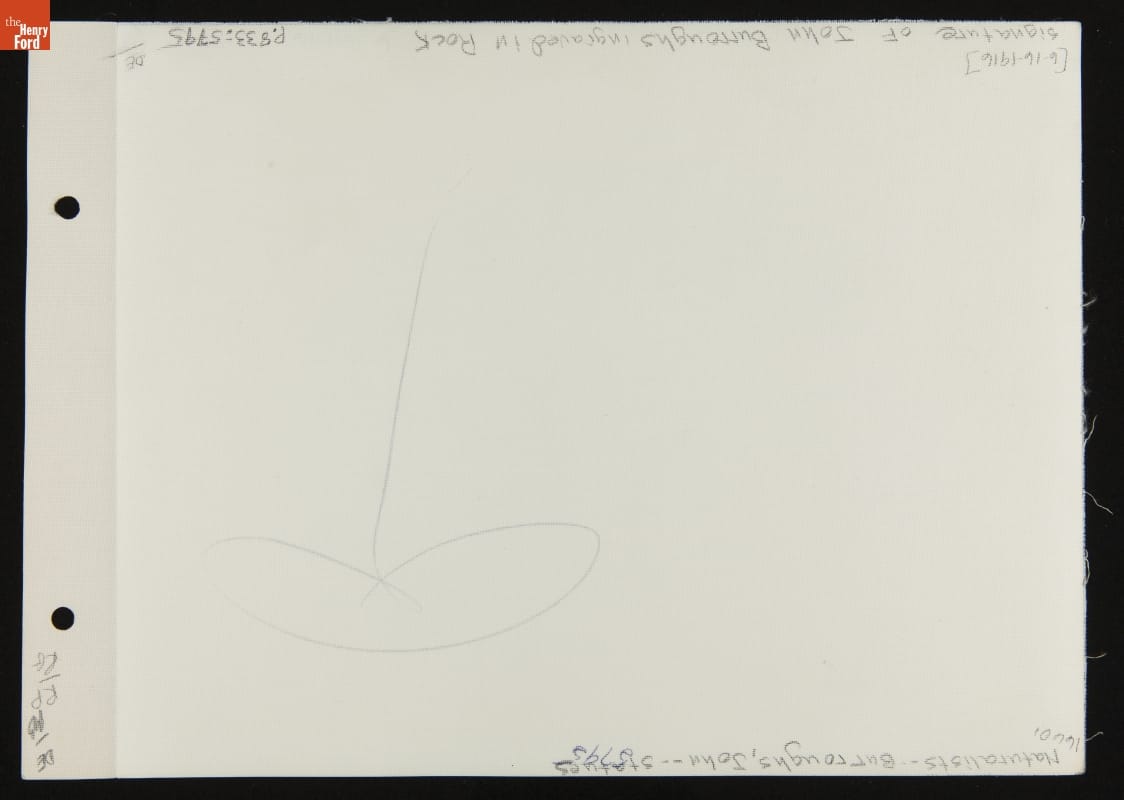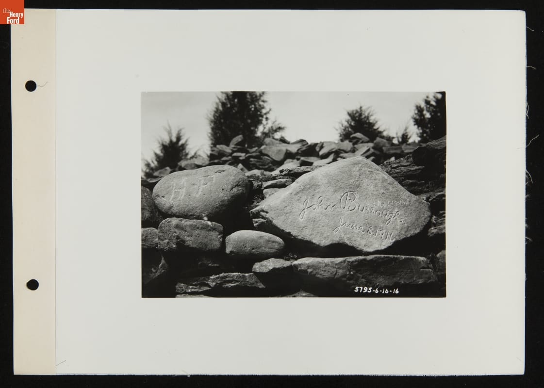 Henry Ford befriended naturalist John Burroughs in the early 1910s. The two shared a mutual love of birds and nature. In 1916, Ford dedicated a wildlife shrine to Burroughs at Fair Lane, Ford's home in Dearborn, Michigan. The "Burroughs Grotto" contained a heated bird bath, a statue of the Burroughs, and this stone with the signature of the famed naturalist.