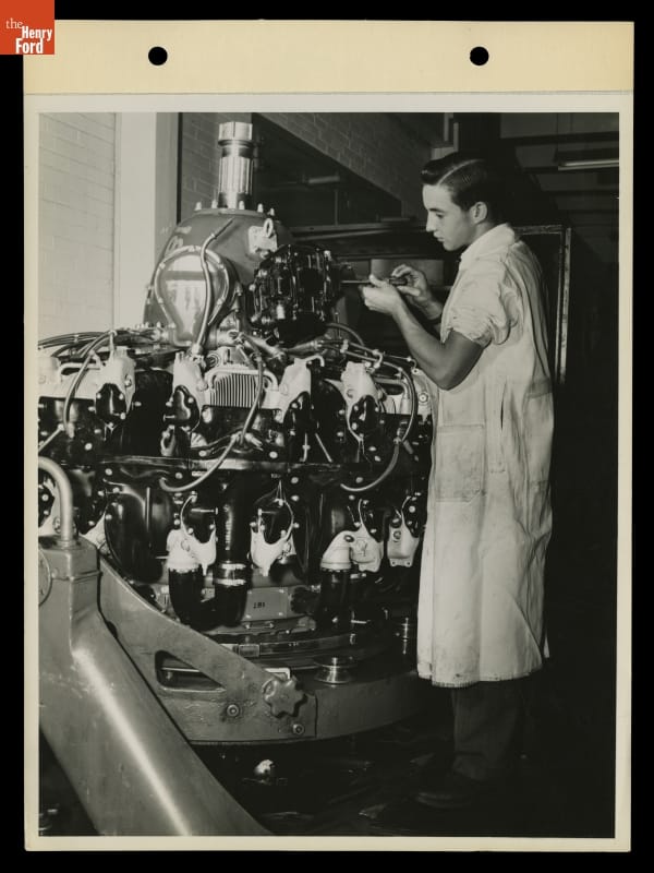 Although Ford Motor Company wartime production of B-24 Bombers at its Willow Run Plant is better known, the company also produced Pratt & Whitney aircraft engines at its Rouge Plant facility during World War II. William Clay Ford (1925-2014), Henry Ford's grandson and Edsel and Eleanor Clay Ford's youngest child, is shown here working on one of these engines.