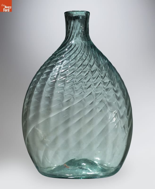 American glass factories produced flasks, like this one, from the late 1700s well into the mid-1800s. The pint-sized flask could hold water but more likely contained alcoholic beverages. Its textured decorative exterior -- formed when the hot glass was dipped into a pattern mold before it was blown -- made the flask easier to grasp. And its flattened shape fit nicely into pockets providing ready access to the liquid refreshment.