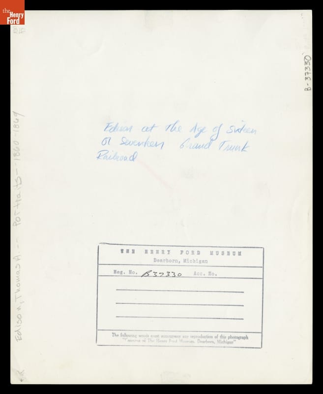 As a young man, Thomas Edison worked as an itinerant telegrapher for various railroads, as well as Western Union and the Associated Press. Some of his earliest inventions were in the field of telegraphy. This portrait shows Edison at about 18 years of age, during his time as a telegrapher with the Grand Trunk Western Railroad.