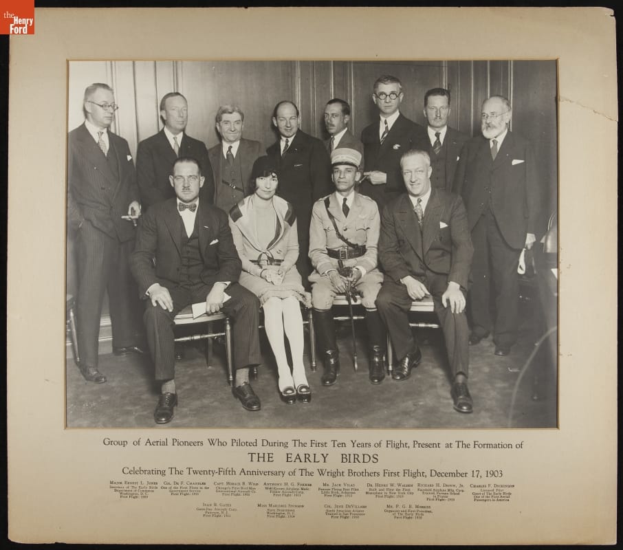 The "Early Birds," a group of pilots who started flying in the first ten years after the airplane's invention, met in 1928 to commemorate the 25th anniversary of the Wright brothers' historic 1903 flight. Marjorie Stinson represented pioneering female aviators. Stinson flew in early exhibitions and, at her family's flying school, trained pilots for the Allied Powers during World War I.