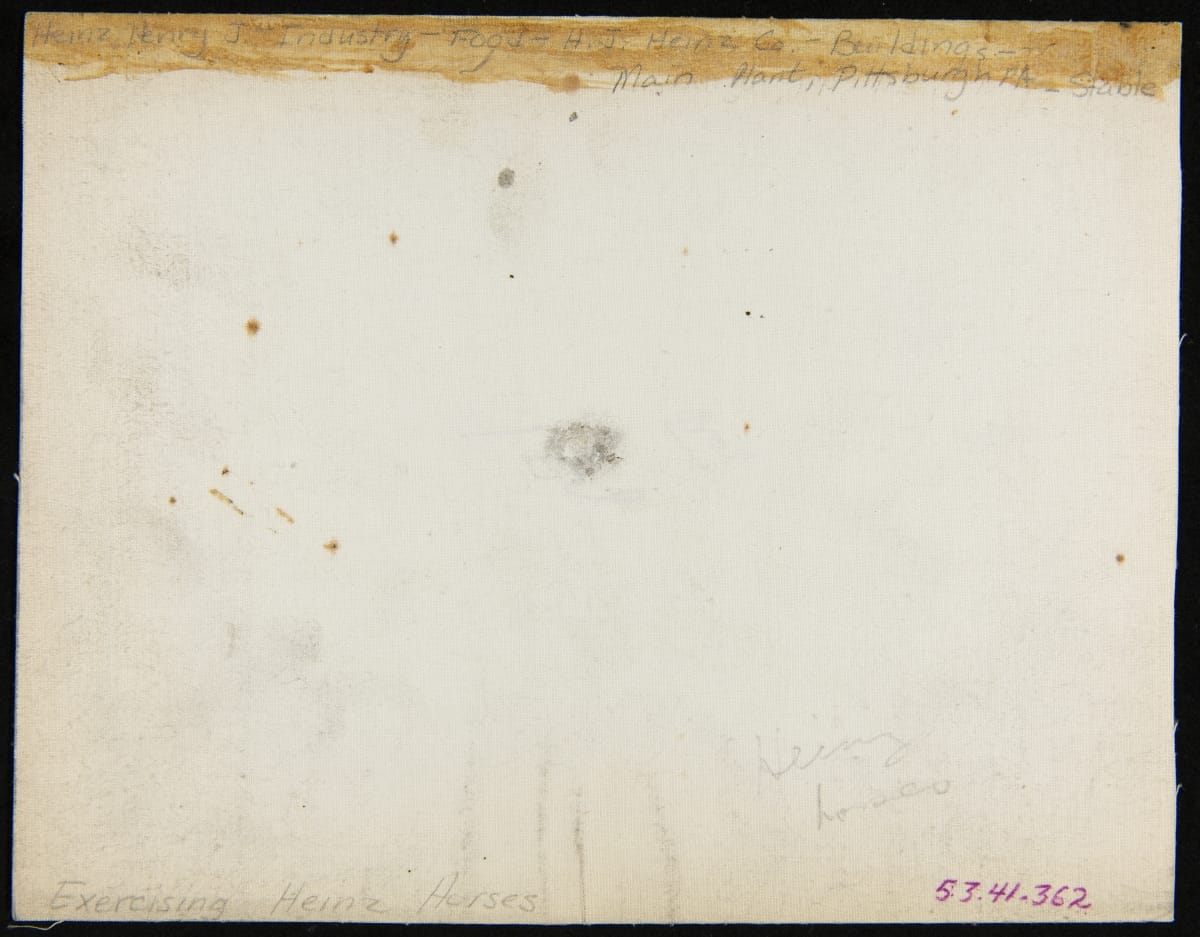 Before the 1920s, the H.J. Heinz Company transported their goods by rail and by horse-drawn wagons. The main factory in Pittsburgh, Pennsylvania, had top-of-the-line stables, sometimes referred to as "equine palaces," where the horses received only the best feed and care. In this photograph, employees are exercising the horses on the grounds within the factory complex.