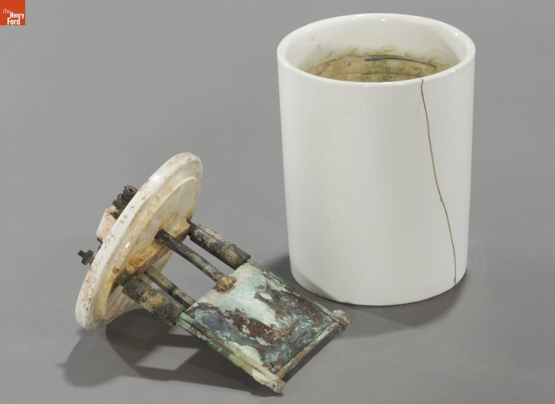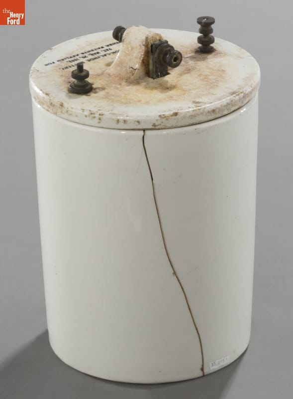 A chemical reaction hidden within this battery's white porcelain jar creates electricity. Thomas Edison developed this battery from an earlier design by Felix Lalande and Georges Chaperon. Batteries like this powered fans, phonographs, telephones, and a variety of other devices for years in places where the electric grid did not reach, or electric generators were impractical.