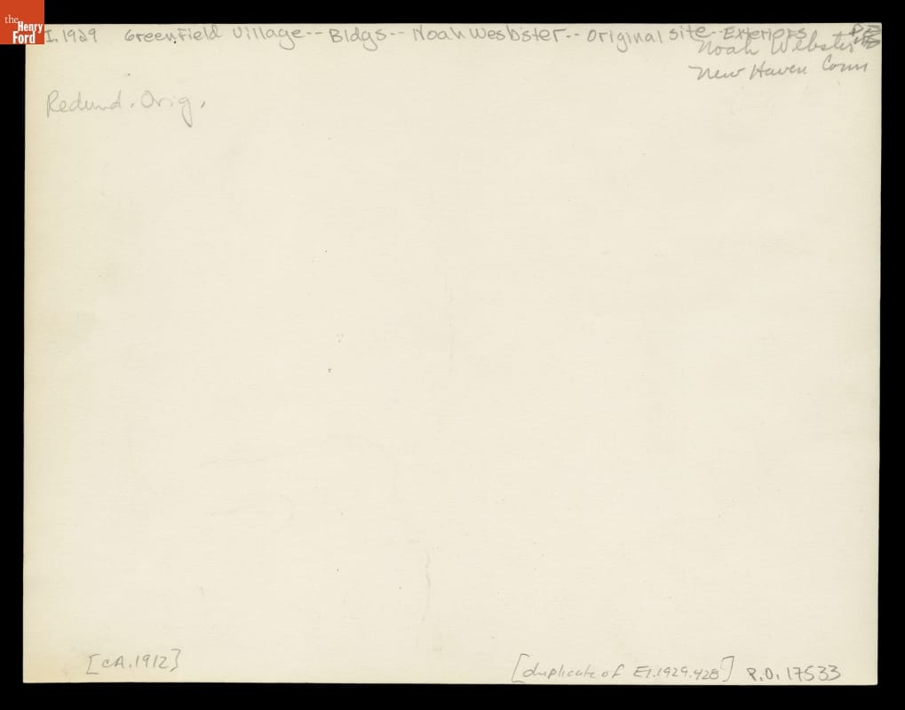 This is textbook pioneer and spelling reformer Noah Webster's home on its original site in New Haven, Connecticut. Henry Ford admired Webster and recognized his house as an important piece of American history. Ford had the building moved to Greenfield Village - his historical outdoor museum in Dearborn, Michigan. This view documents side and rear additions not moved with the house.